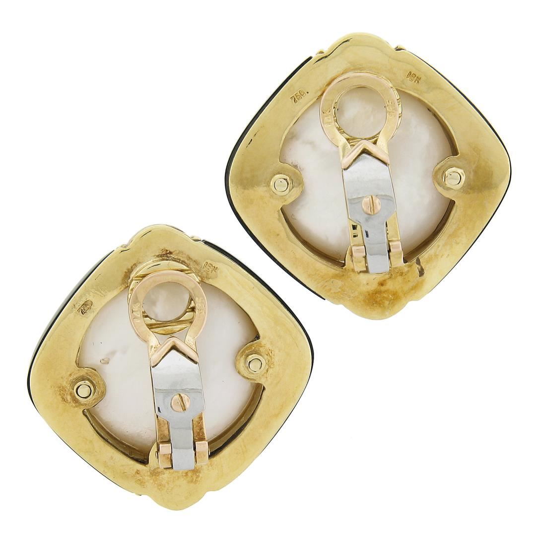 A vintage solid 18k yellow gold button earrings, with 2 round shape cultured mabe pearls (19.6mm each), 20 round cut natural diamonds (G/H - VS1-SI1 ; 0.20ctw), and 4 custom cut natural black onyx.The earrings measure approximately 30.1mm in diameter and weigh a total of 34.05 grams.