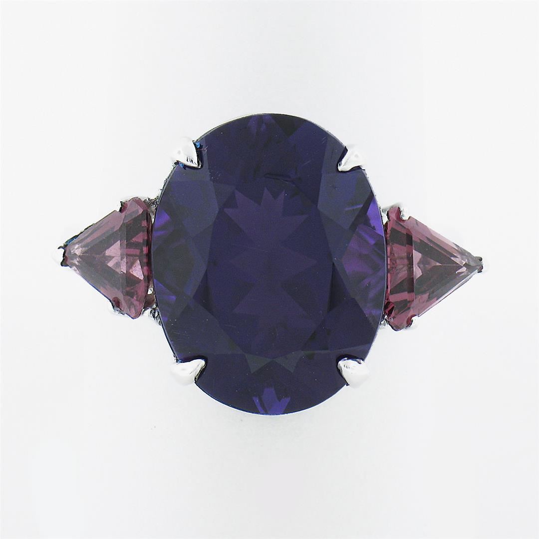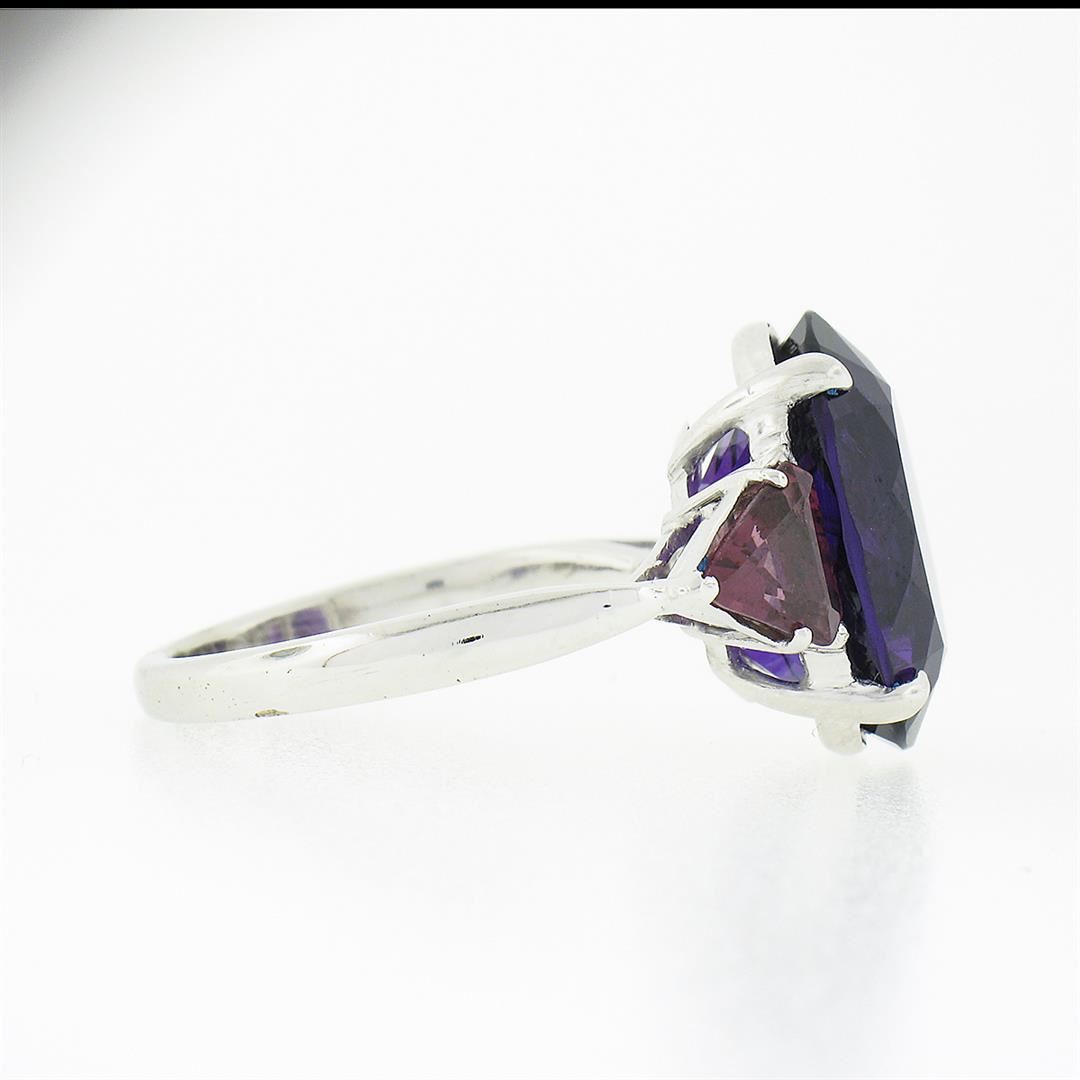 A solid 18k white gold ring, with 1 oval brilliant cut natural amethyst (16.3x12.7mm - 9.25ct), and 2 trillion cut natural garnets (1.80ctw). The ring is size 9.5, weighs a total of 8.25 grams, and measures 16.30mm wide.