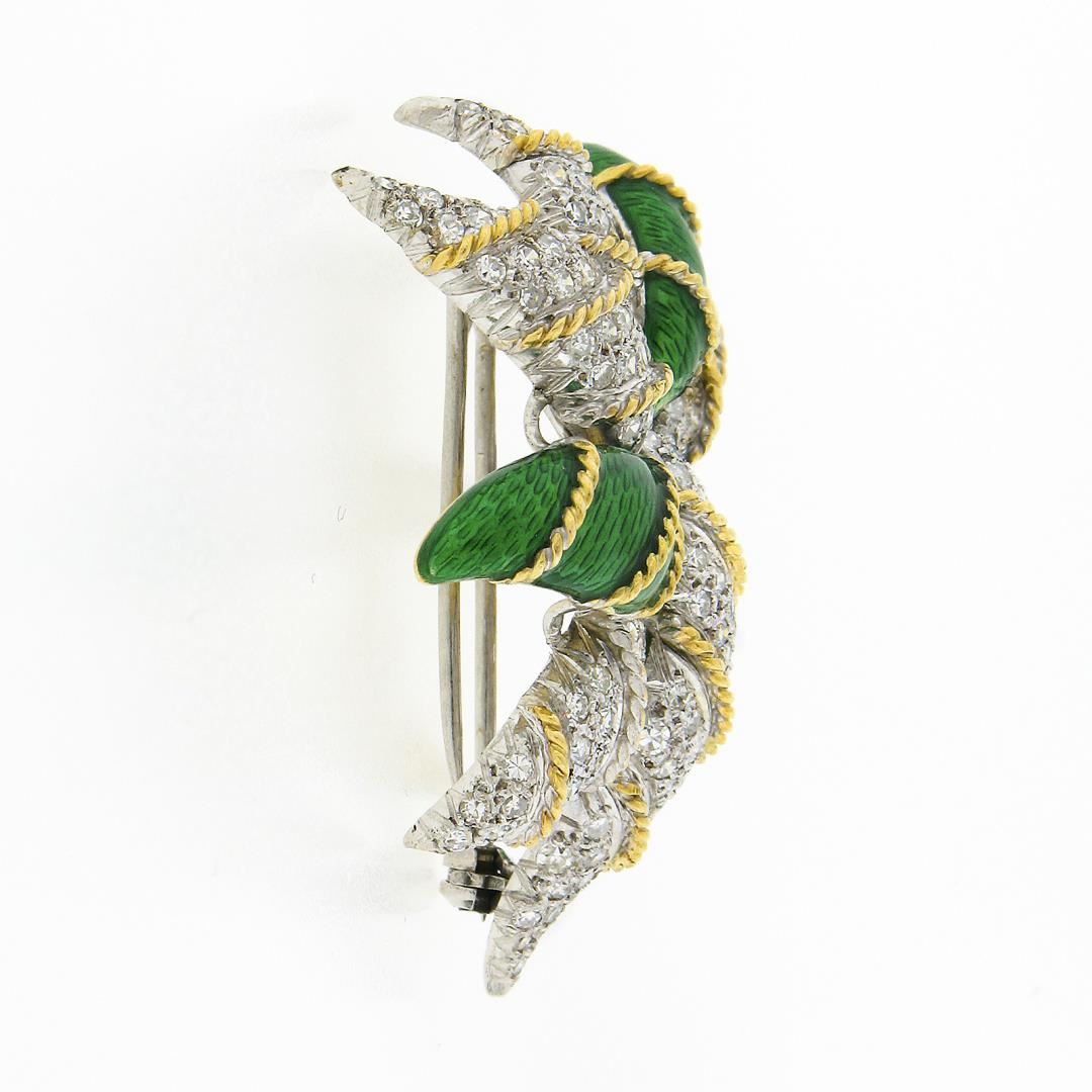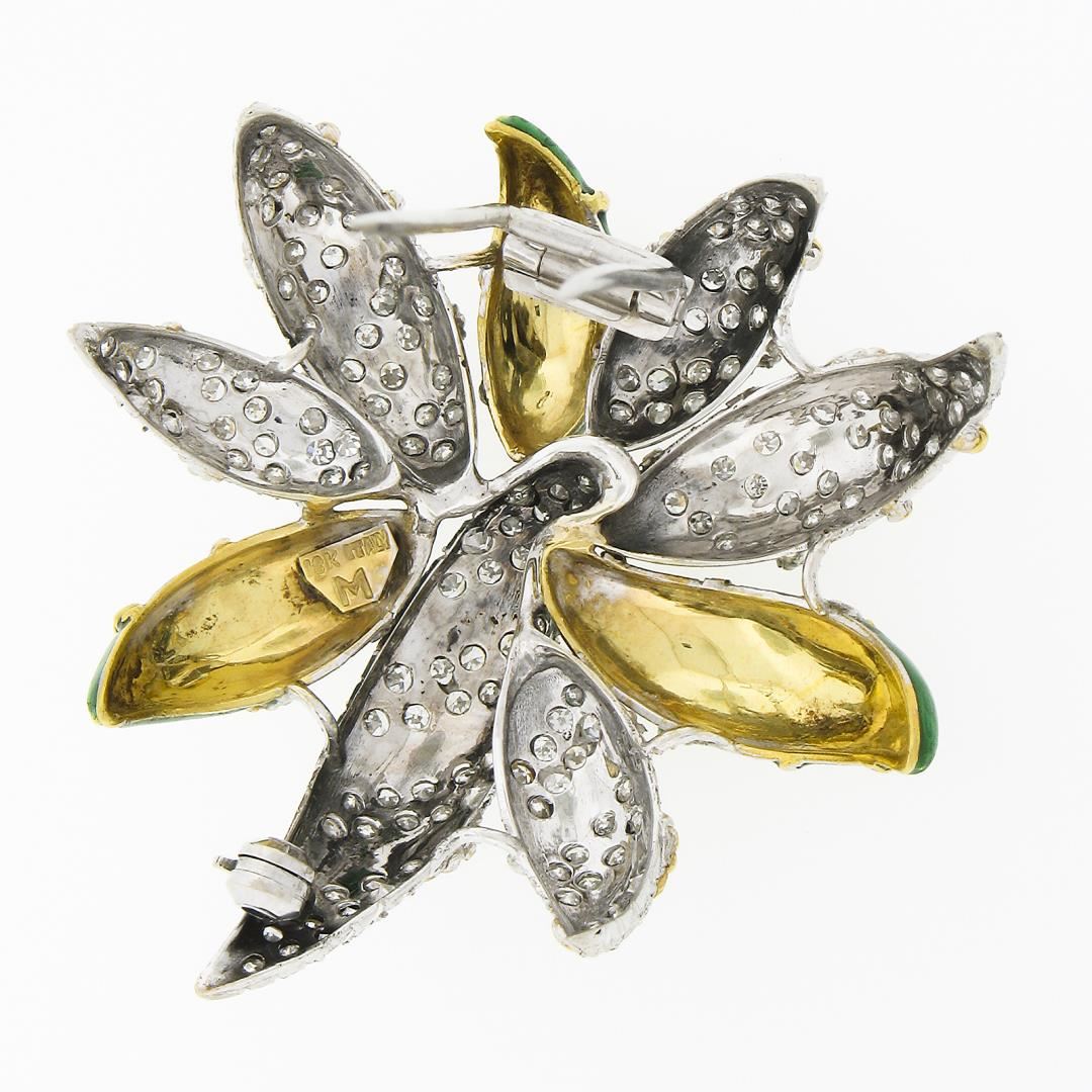 a vintage 18k white & yellow gold enamel work flower brooch. with 156 old single cut natural diamonds (G/H - VS2/SI1 ; 1.20ctw ). Measures 45.10x46.20mm and weighs a total of 21.47 grams.