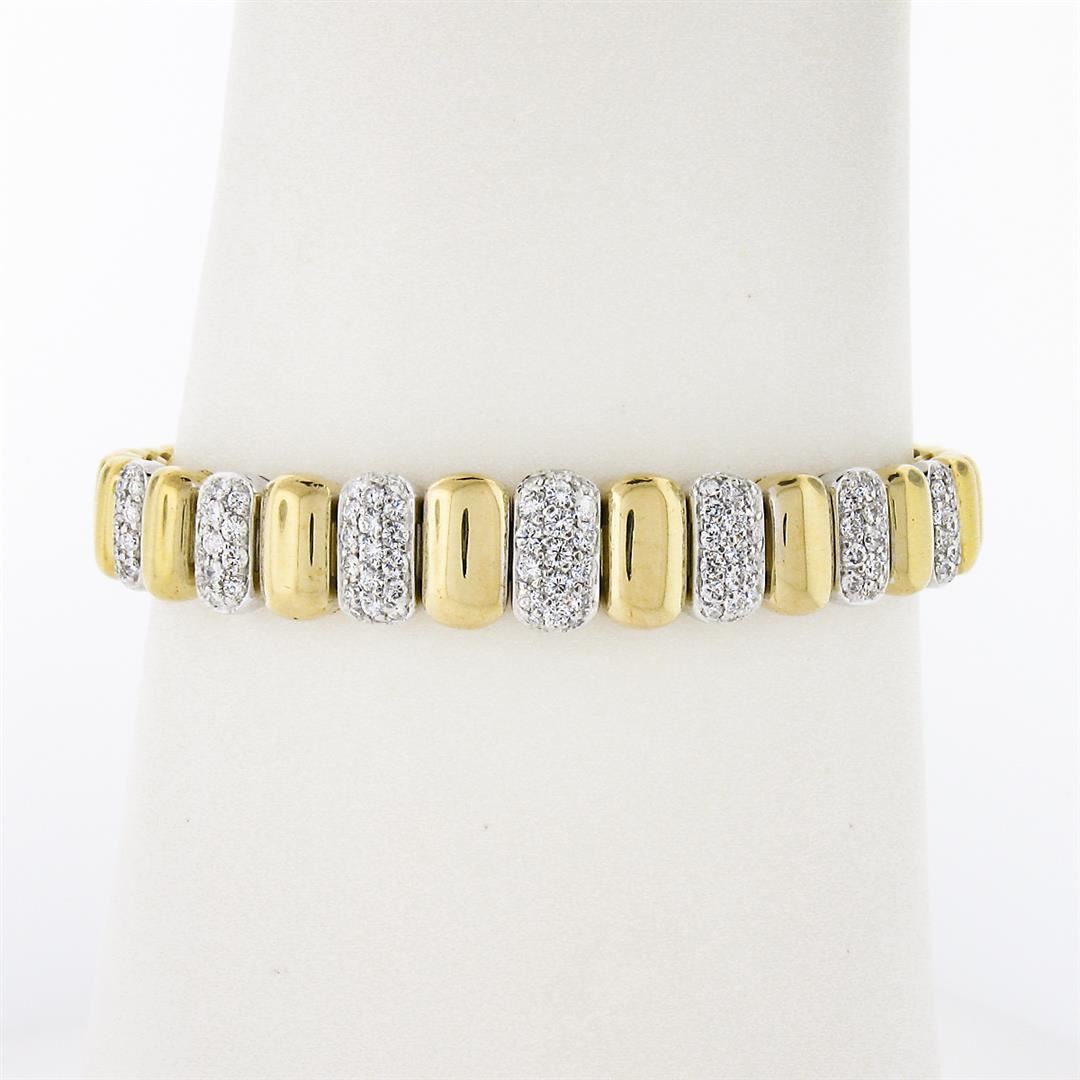 A vintage solid 18k yellow and white gold oval link bracelet, with 109 round brilliant cut natural diamonds ( F/G - VS1/VS2 ; 1.50ctw). It weighs a total of 44.05 grams, measures 10.30mm wide, and measures 6.25 inches in length.