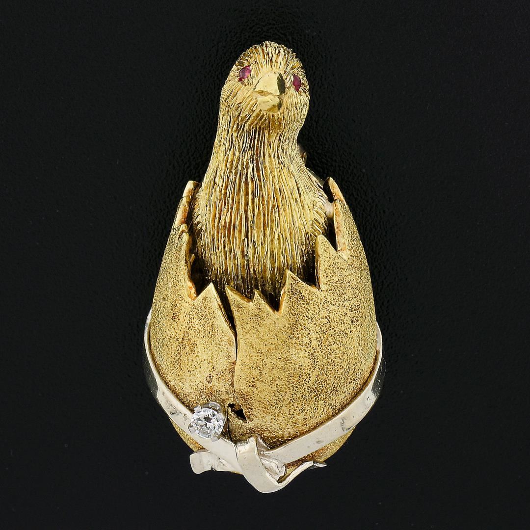 A vintage solid 18k yellow & white gold brooch, with 1 round cut natural diamond (G - VS2 ; 0.07ct ), and 2 rose cut natural rubies (0.03ctw). Measures 37x20.5mm and weighs a total of 15.79 grams.