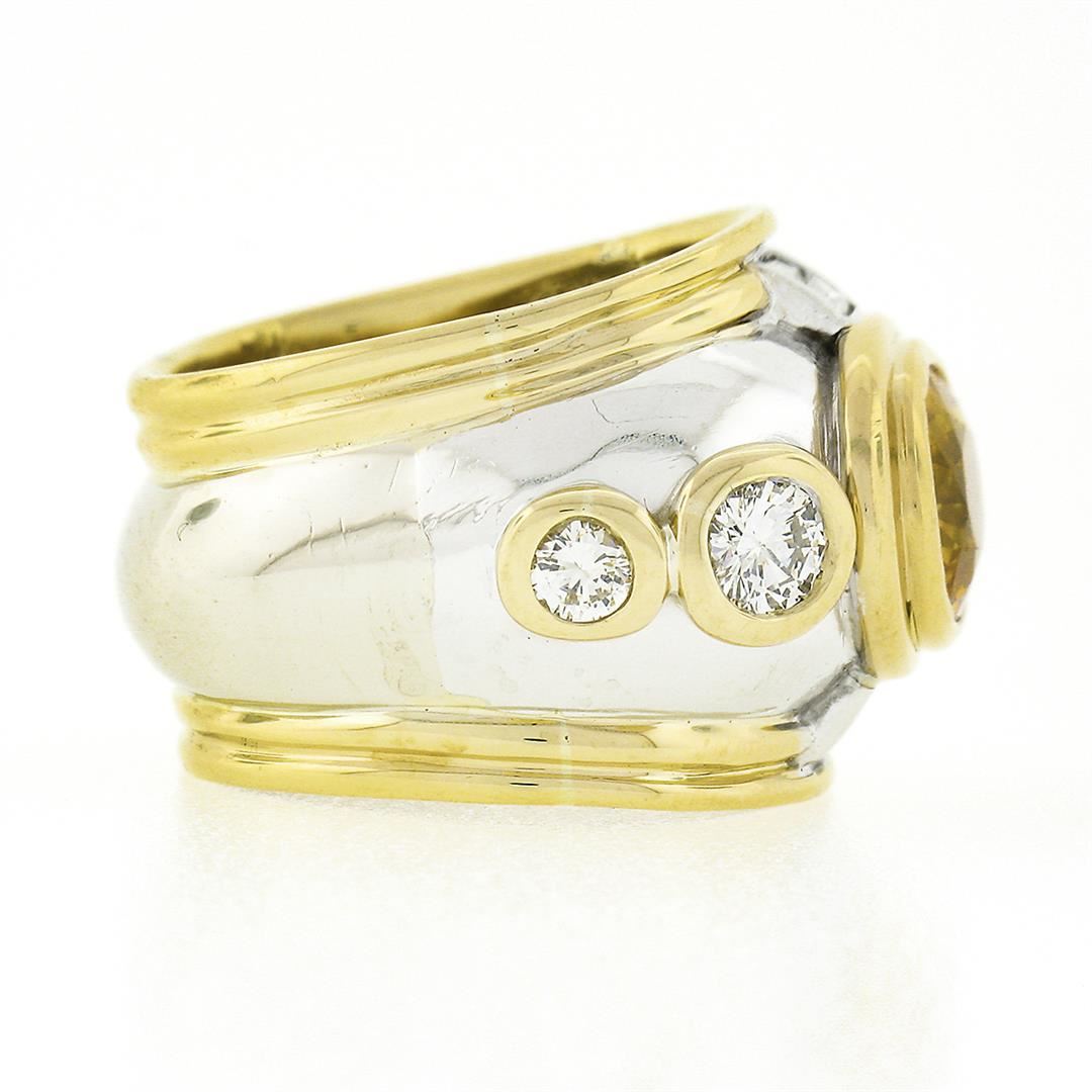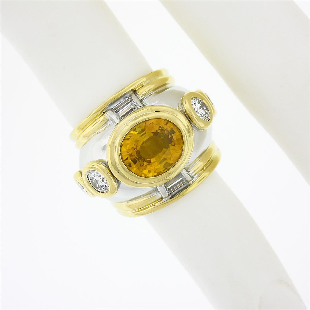 A vintage solid 18k white & yellow gold band ring, with 1 Gia certified oval cut natural yellow sapphire (2.75ct), and 4 round brilliant cut natural diamonds (F - VS1 ; 0.70ctw). & 4 baguette cut natural diamonds (F/G - VS1/VS2 ; 0.24ctw). The ring is size 4.0, weighs a total of 15.45 grams, and measures 16.70mm wide. Comes with all original relevant certifications.