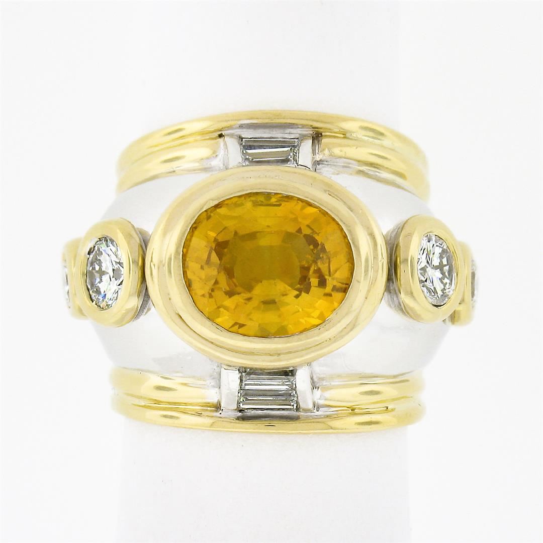 A vintage solid 18k white & yellow gold band ring, with 1 Gia certified oval cut natural yellow sapphire (2.75ct), and 4 round brilliant cut natural diamonds (F - VS1 ; 0.70ctw). & 4 baguette cut natural diamonds (F/G - VS1/VS2 ; 0.24ctw). The ring is size 4.0, weighs a total of 15.45 grams, and measures 16.70mm wide. Comes with all original relevant certifications.