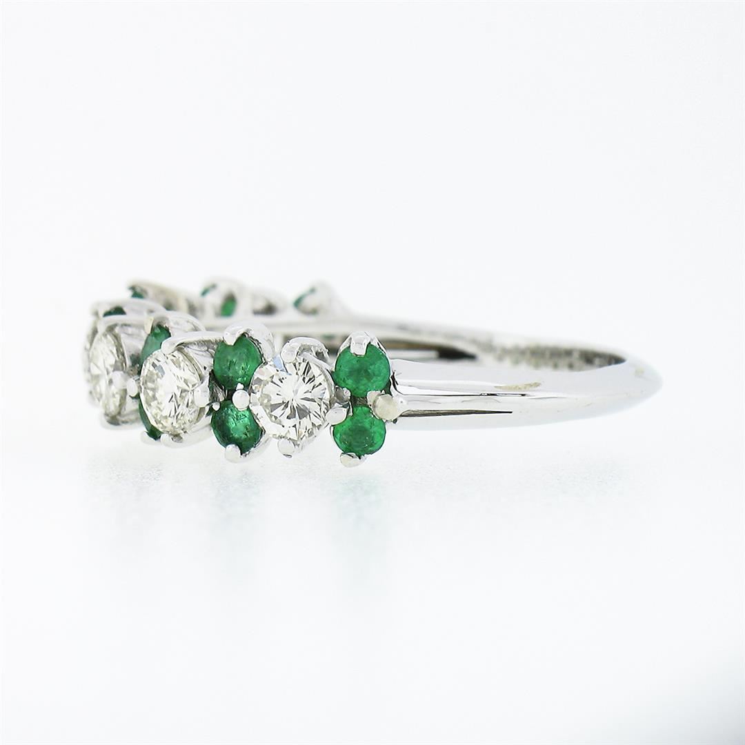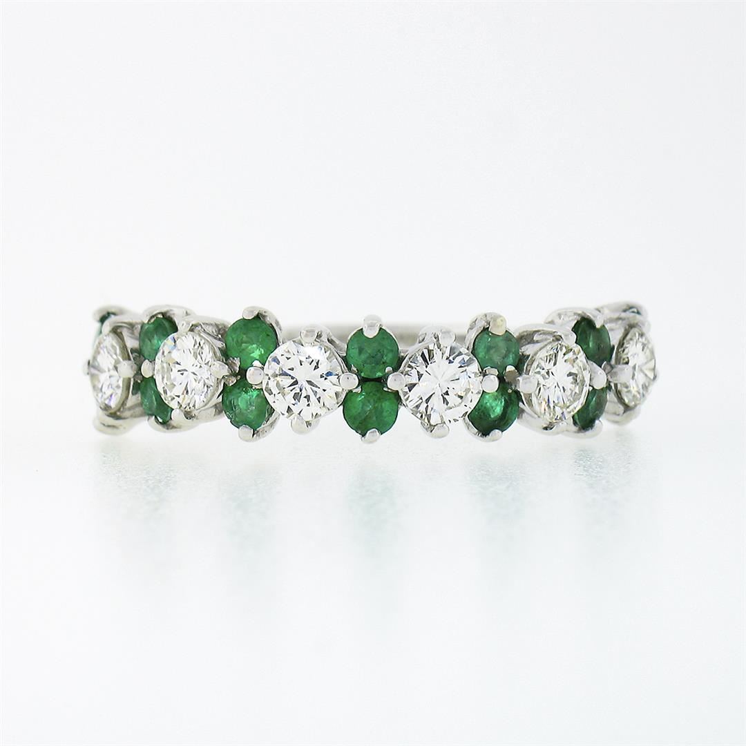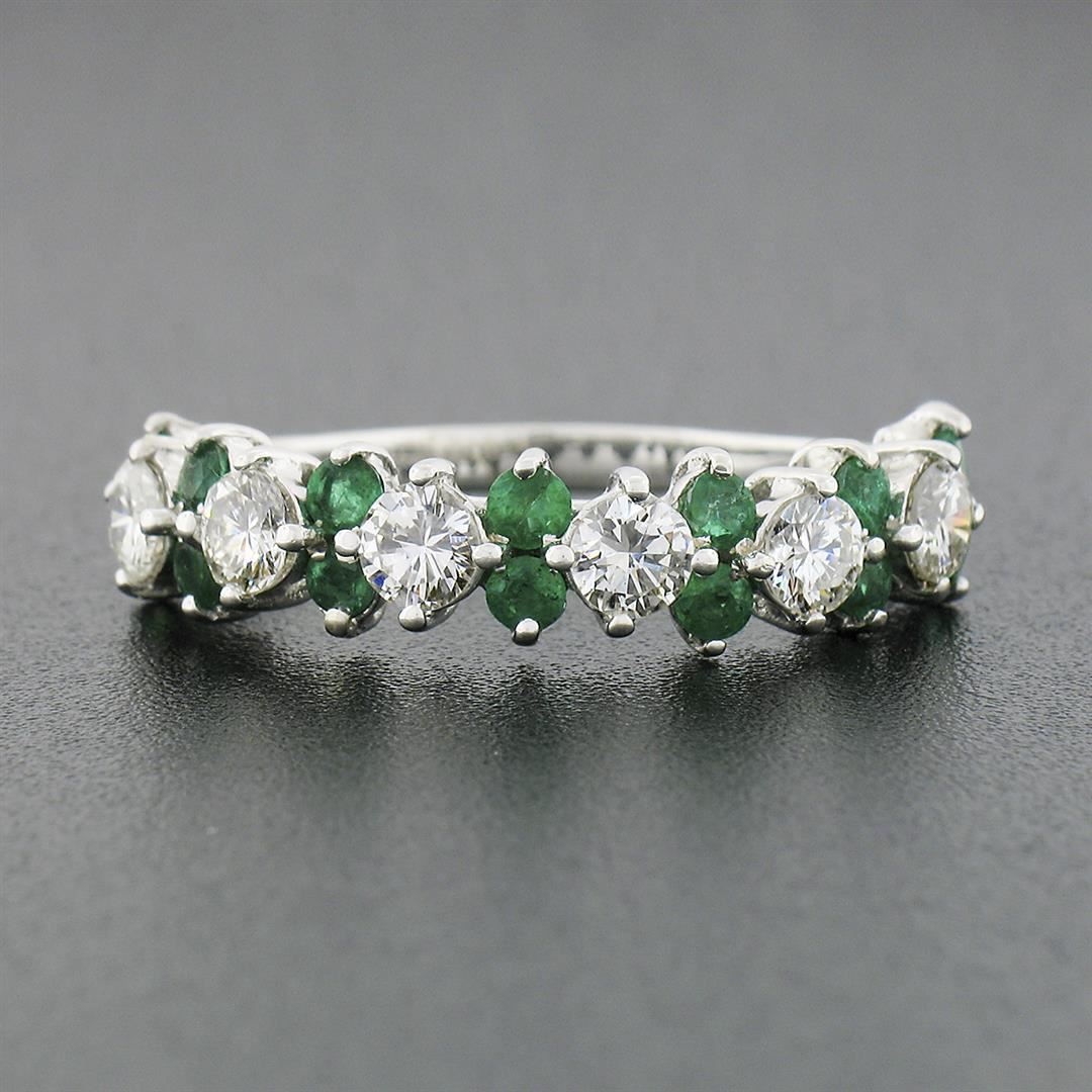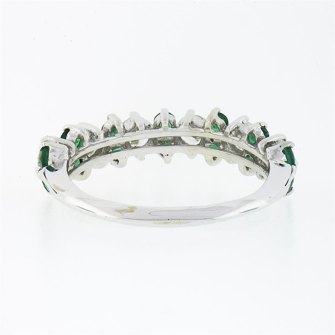A solid 18k white gold band ring, with 14 round brilliant cut natural emeralds (0.60ctw), and 6 round brilliant cut natural diamonds (G/H - VS1/VS2 ; 1.10ctw). The ring is size 9.5, weighs a total of 3.78 grams, and measures 5.95mm wide.