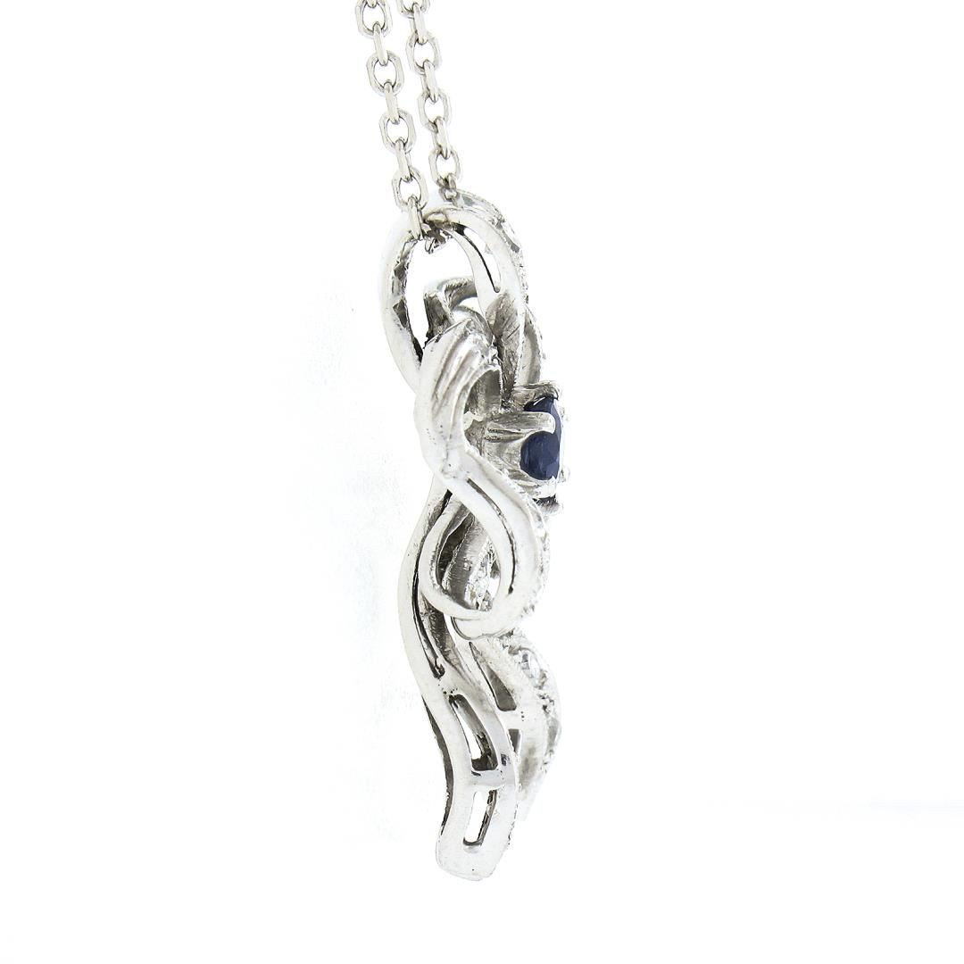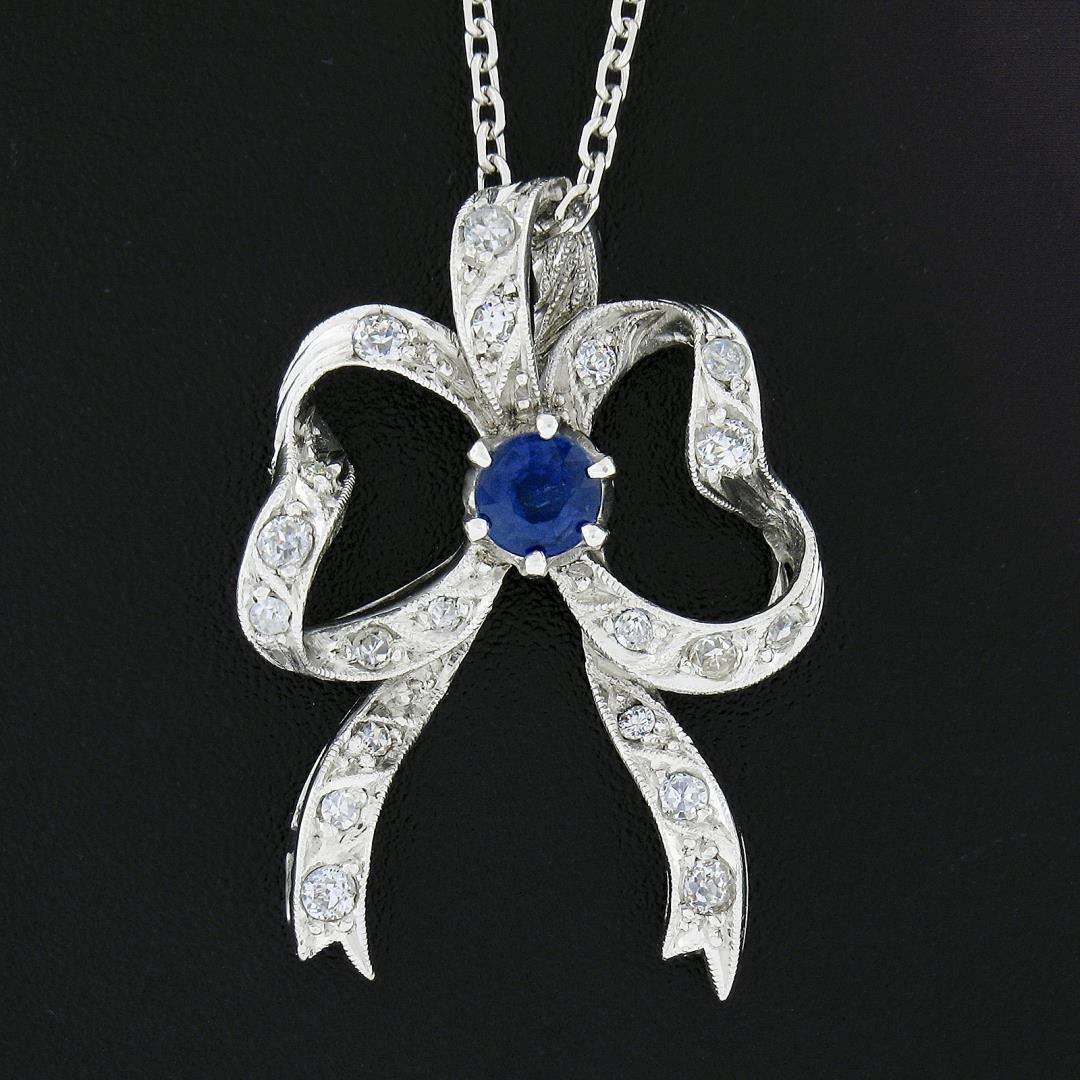 A vintage solid 18k white gold ribbon pendant necklace, with old round cut natural sapphire (4.5mm / 0.50ctw), and 20 old single & old European cut natural diamonds (H/I - SI1/SI2 ; 0.50ctw ). 18 inch cable link chain, 6.81 grams total weight, pendant measures 29.6x21.3mm.