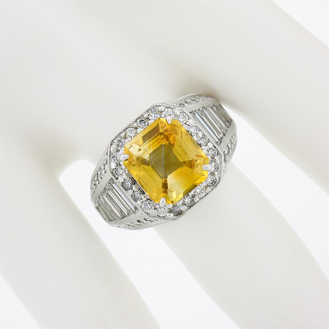 A vintage solid 18k white gold ring, with 1 gia certified Octagonal Step Cut orange yellow sapphire (4.05ct), and 12 baguette cut natural diamonds (F/G - VVS2/VS1 ; 2.30ctw), with 48 round brilliant cut natural diamonds (F/G - VS1/VS2 ; 0.60ctw). The ring is size 7.5, weighs a total of 10.21 grams, and measures 13.30mm wide. Comes with all original relevant certifications.