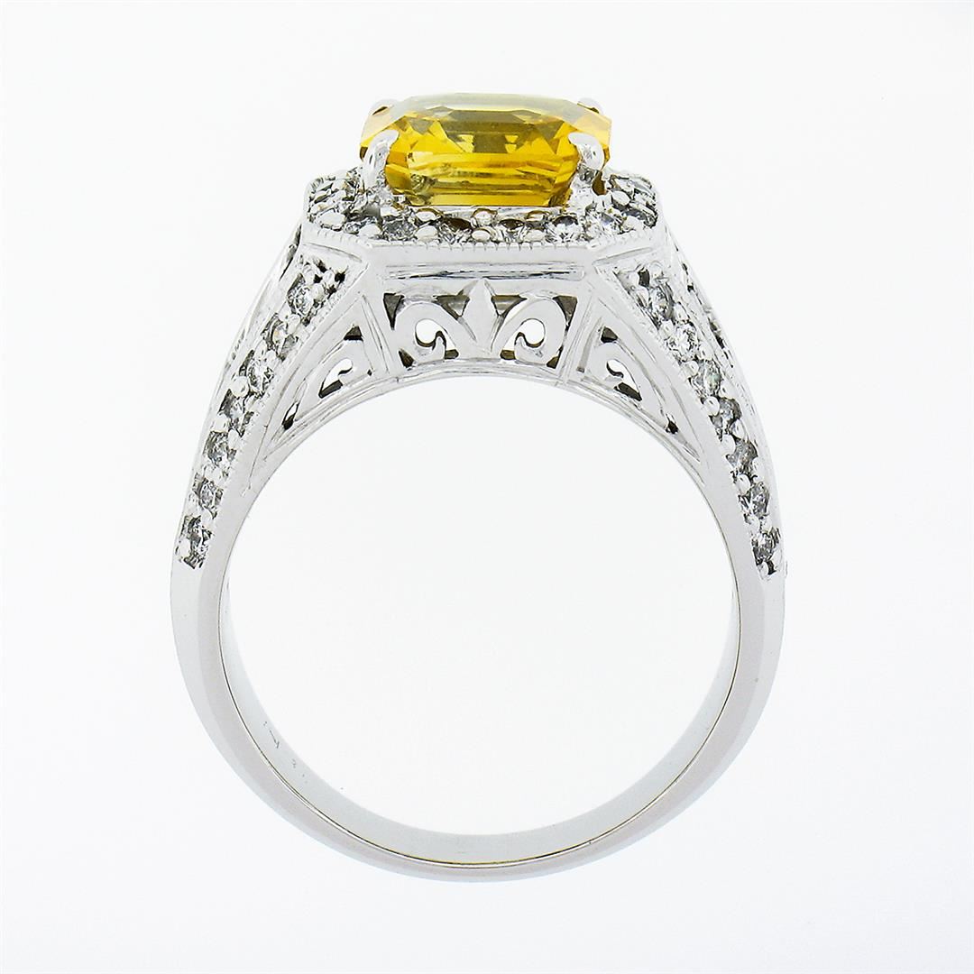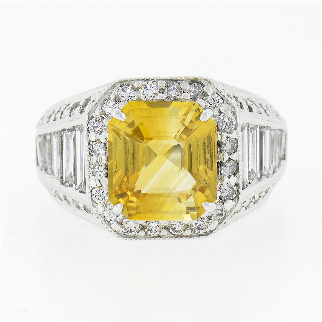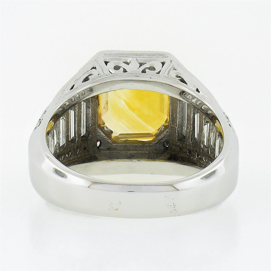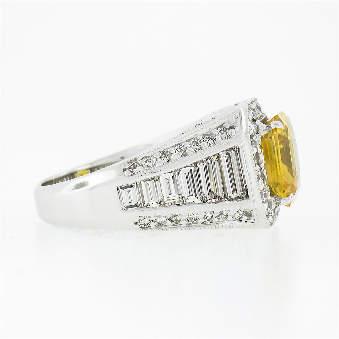 A vintage solid 18k white gold ring, with 1 gia certified Octagonal Step Cut orange yellow sapphire (4.05ct), and 12 baguette cut natural diamonds (F/G - VVS2/VS1 ; 2.30ctw), with 48 round brilliant cut natural diamonds (F/G - VS1/VS2 ; 0.60ctw). The ring is size 7.5, weighs a total of 10.21 grams, and measures 13.30mm wide. Comes with all original relevant certifications.