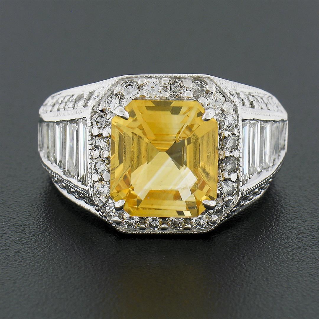 A vintage solid 18k white gold ring, with 1 gia certified Octagonal Step Cut orange yellow sapphire (4.05ct), and 12 baguette cut natural diamonds (F/G - VVS2/VS1 ; 2.30ctw), with 48 round brilliant cut natural diamonds (F/G - VS1/VS2 ; 0.60ctw). The ring is size 7.5, weighs a total of 10.21 grams, and measures 13.30mm wide. Comes with all original relevant certifications.