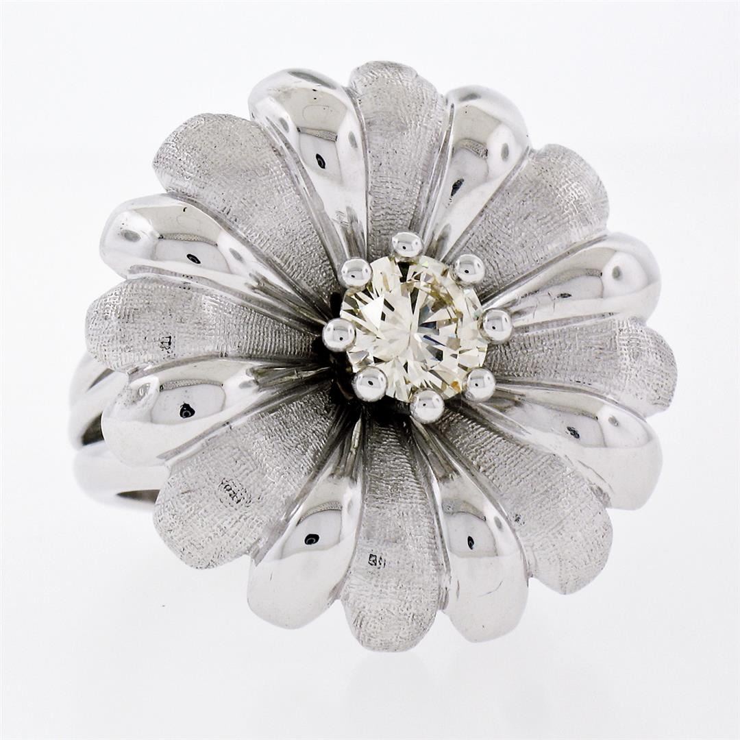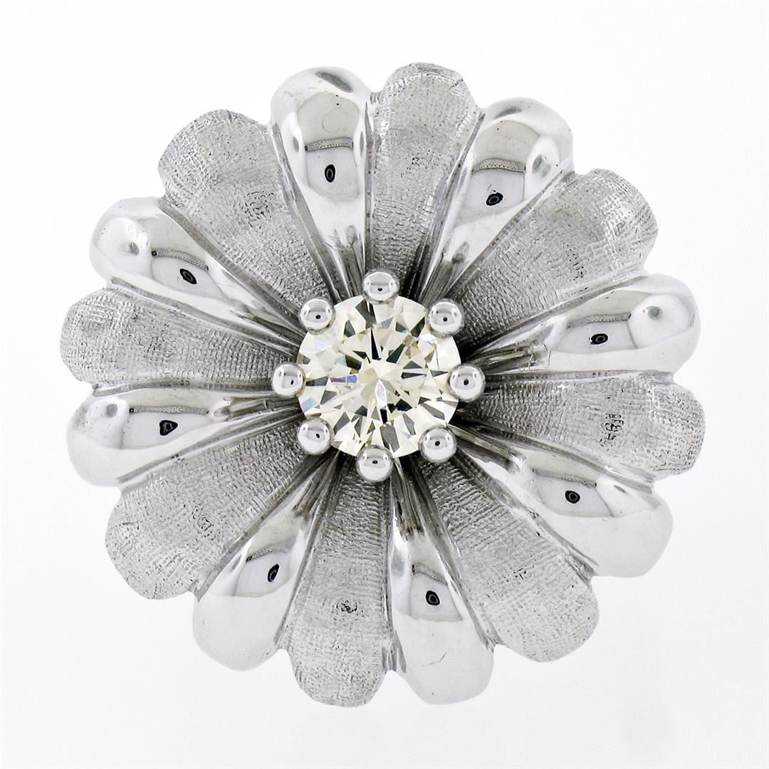Vintage 18K White Gold .78ctw Round Brilliant Diamond Large Cocktail Flower Ring. Please see photos and description for all available information. a vintage soldi 18k white gold flower ring, with 1 round brilliant cut natural diamond (K/L- VS2; 0.78ct). The ring is size 5.5, weighs a total of 17.07 grams, and measures 23.85mm wide.