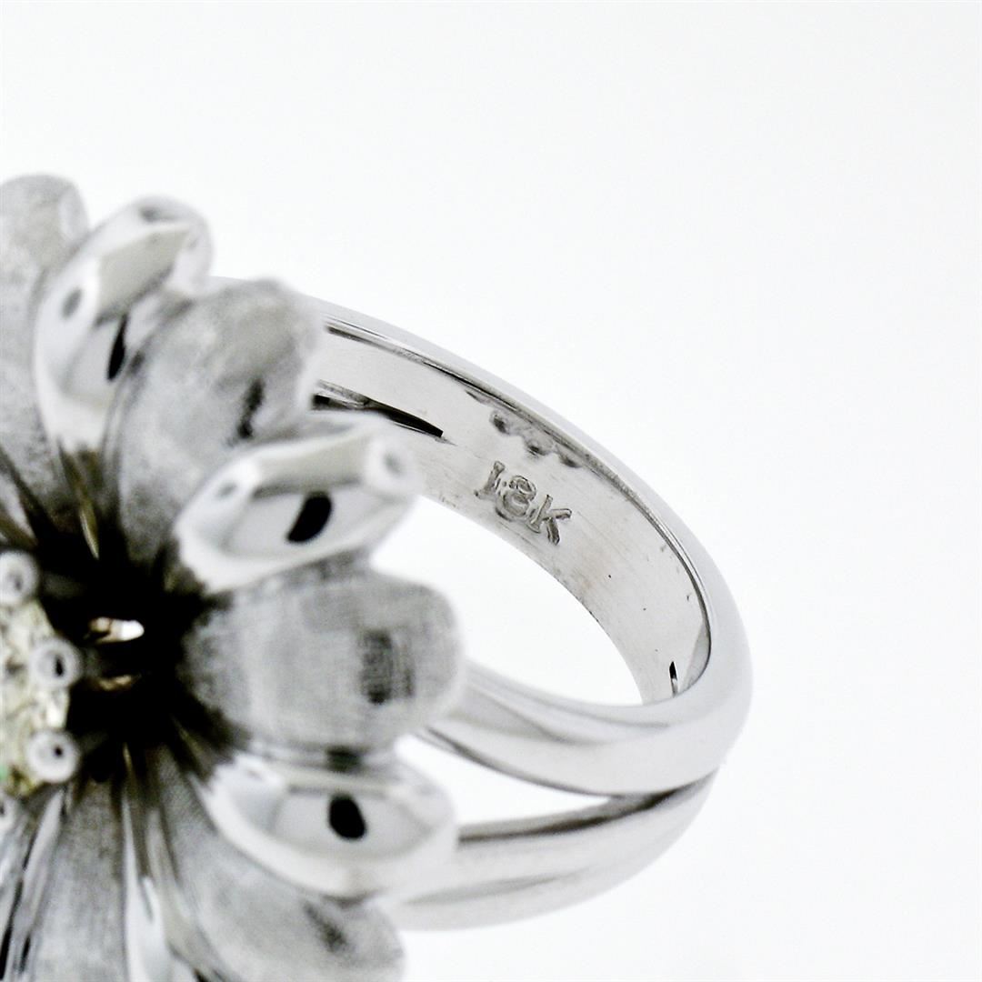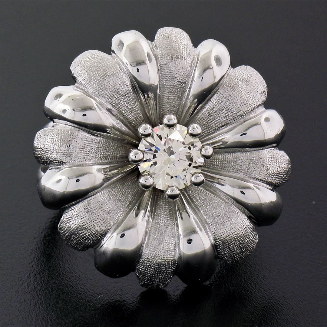 Vintage 18K White Gold .78ctw Round Brilliant Diamond Large Cocktail Flower Ring. Please see photos and description for all available information. a vintage soldi 18k white gold flower ring, with 1 round brilliant cut natural diamond (K/L- VS2; 0.78ct). The ring is size 5.5, weighs a total of 17.07 grams, and measures 23.85mm wide.