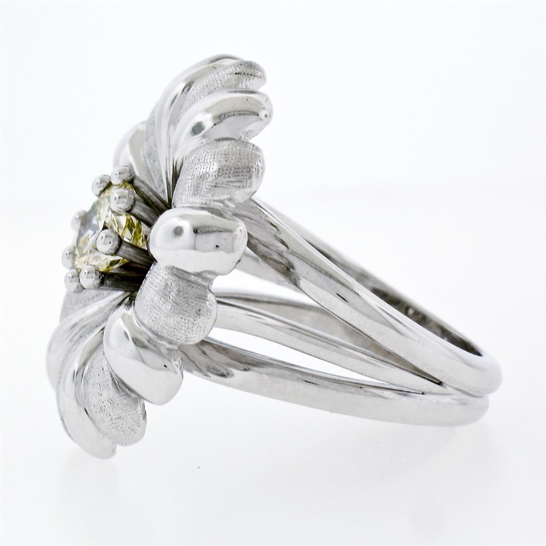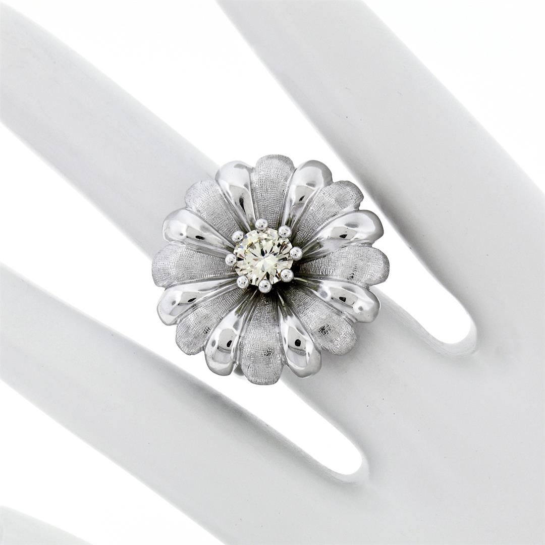 Vintage 18K White Gold .78ctw Round Brilliant Diamond Large Cocktail Flower Ring. Please see photos and description for all available information. a vintage soldi 18k white gold flower ring, with 1 round brilliant cut natural diamond (K/L- VS2; 0.78ct). The ring is size 5.5, weighs a total of 17.07 grams, and measures 23.85mm wide.