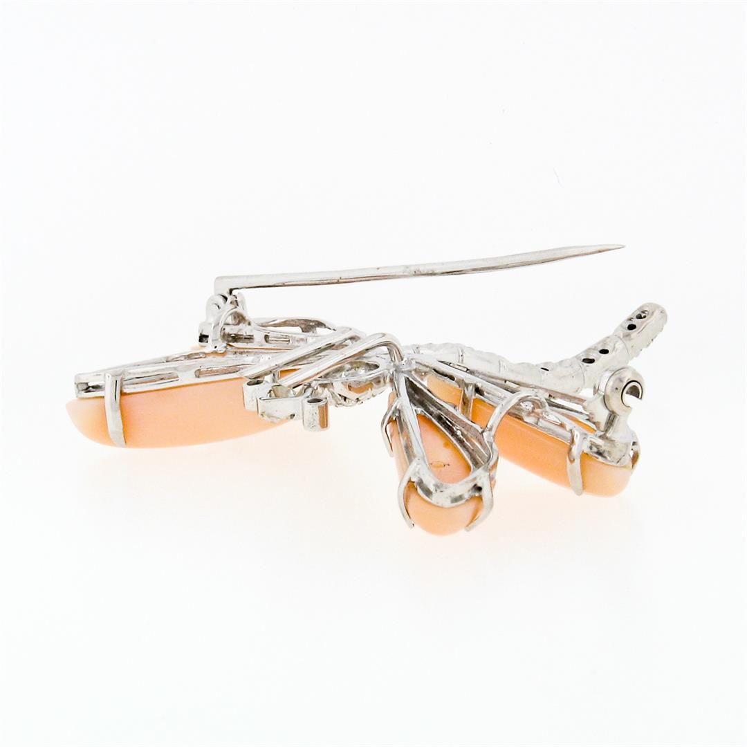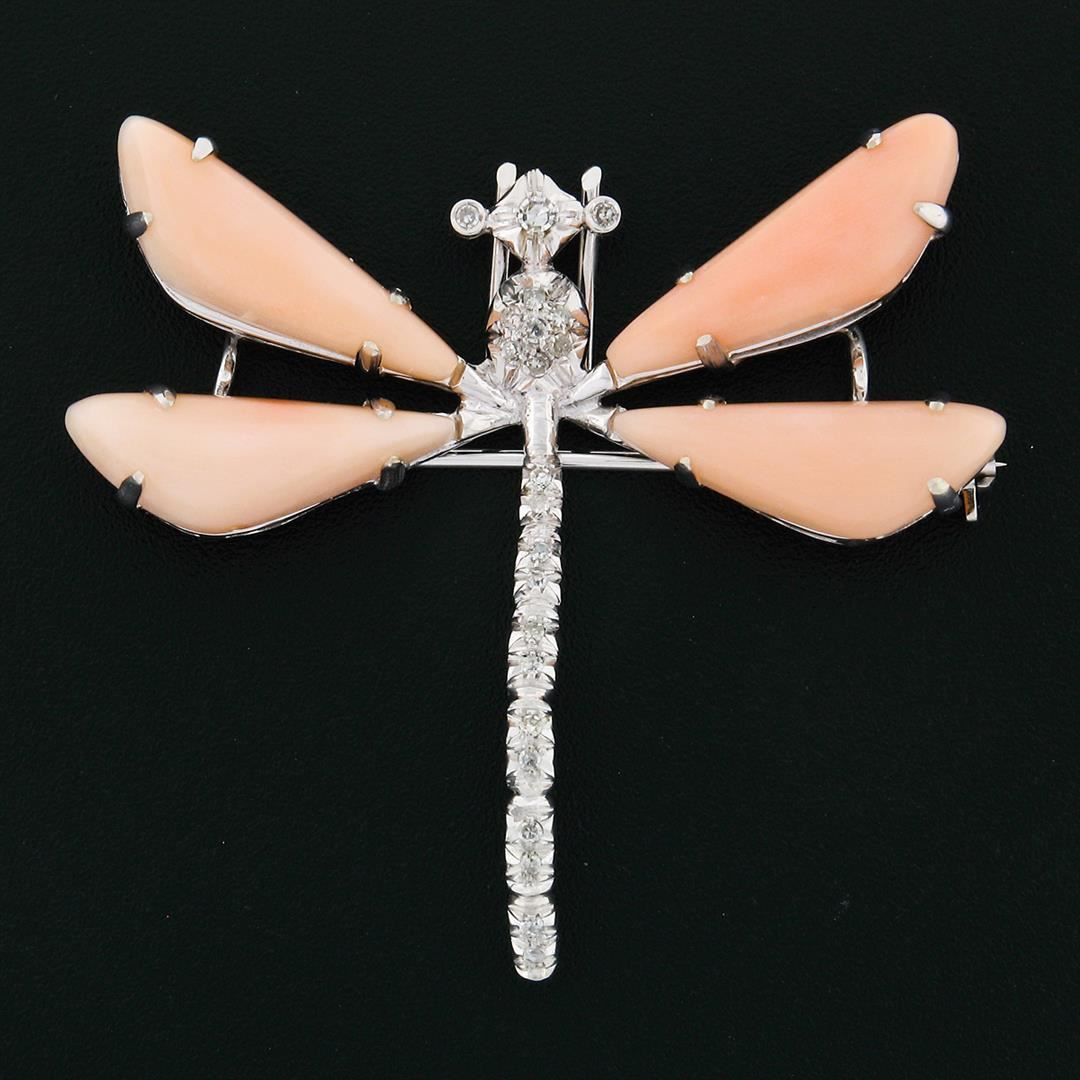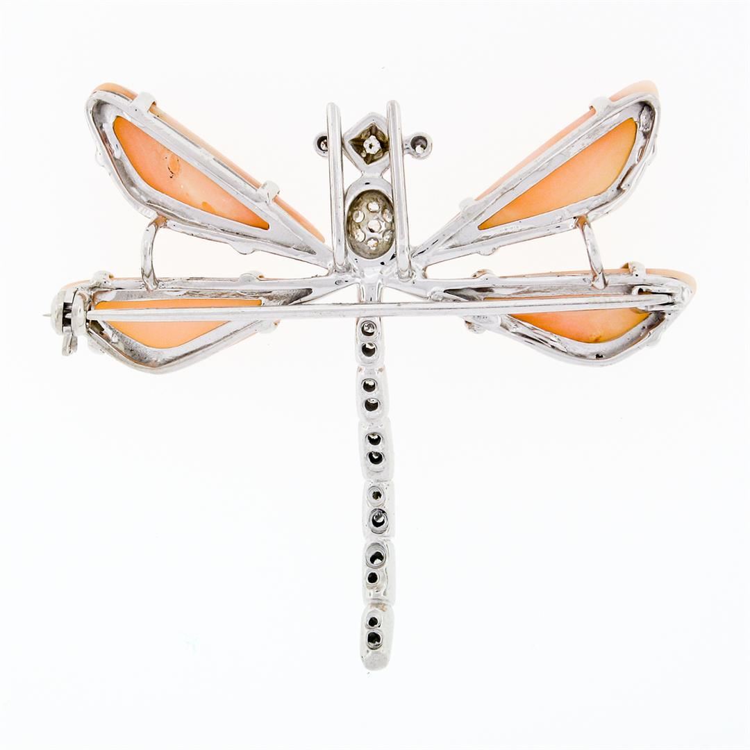 A vintage solid 18k white gold dragonfly pin brooch, with 4 custom cabochon cut natural coral (21.0x7.0mm), and 22 old single cut natural diamonds (G/H - VS2-SI2; 0.25ctw). Measures 42.80x47.25mm and weighs a total of 11.27 grams.
