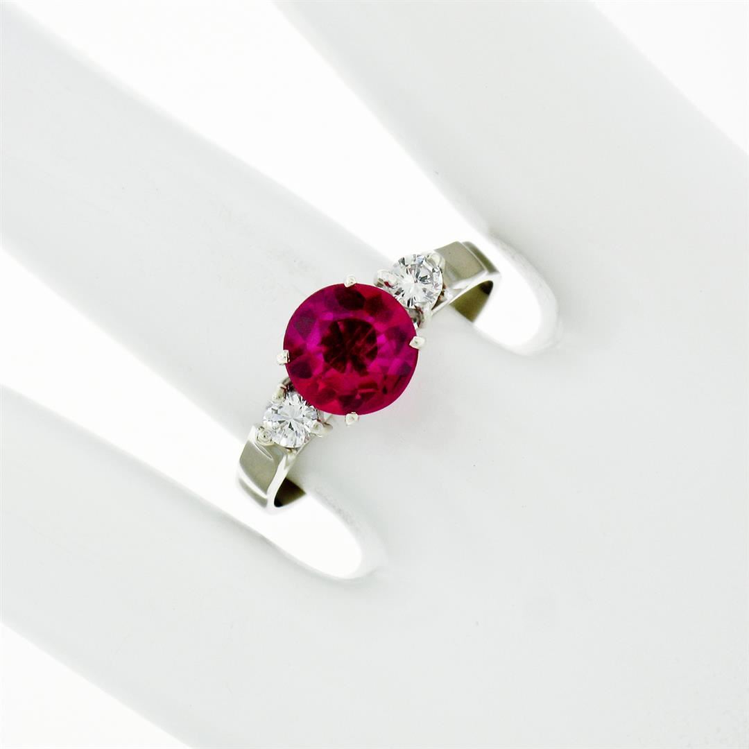 A vintage solid 18k white gold 3 stones ring, with 1 old round cut red stone (7.50mm), and 2 round brilliant cut natural diamonds (F/G- VS1/VS2; 0.22ctw). The ring is size 8.0, weighs a total of 3.60 grams, and measures 7.50mm wide.