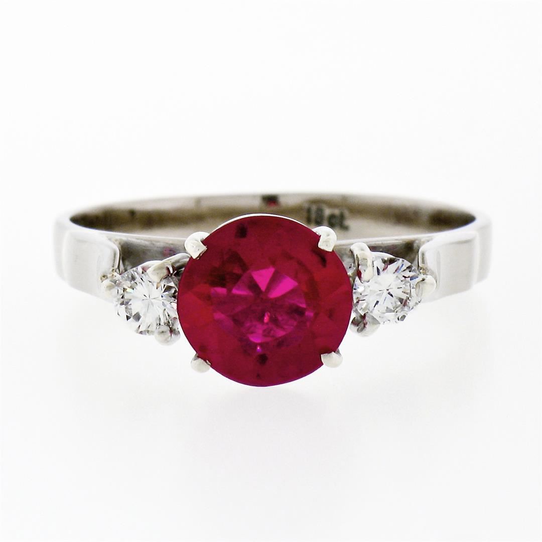 A vintage solid 18k white gold 3 stones ring, with 1 old round cut red stone (7.50mm), and 2 round brilliant cut natural diamonds (F/G- VS1/VS2; 0.22ctw). The ring is size 8.0, weighs a total of 3.60 grams, and measures 7.50mm wide.