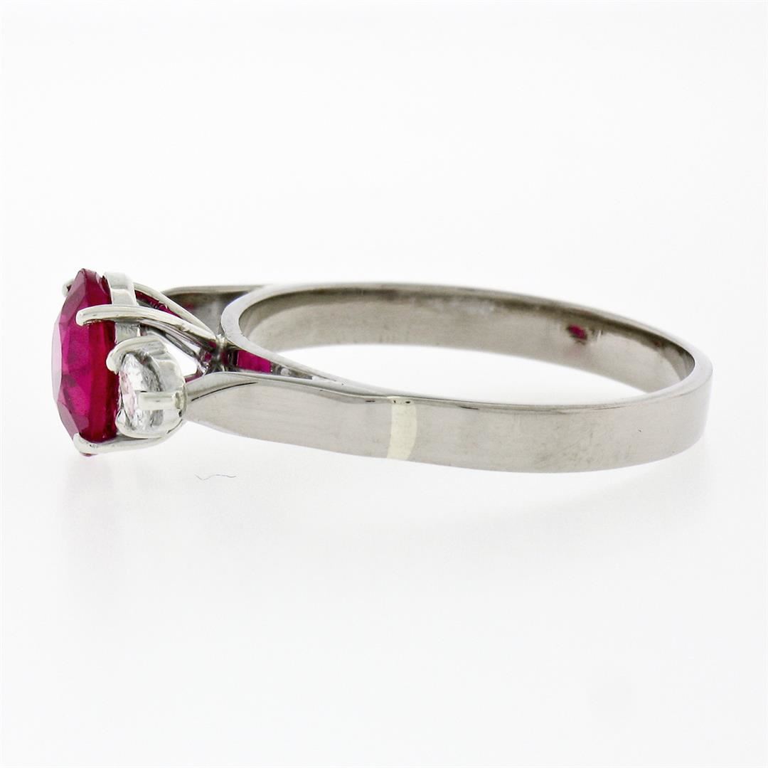 A vintage solid 18k white gold 3 stones ring, with 1 old round cut red stone (7.50mm), and 2 round brilliant cut natural diamonds (F/G- VS1/VS2; 0.22ctw). The ring is size 8.0, weighs a total of 3.60 grams, and measures 7.50mm wide.