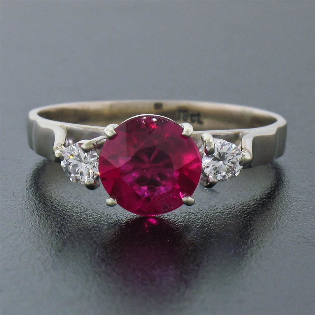 A vintage solid 18k white gold 3 stones ring, with 1 old round cut red stone (7.50mm), and 2 round brilliant cut natural diamonds (F/G- VS1/VS2; 0.22ctw). The ring is size 8.0, weighs a total of 3.60 grams, and measures 7.50mm wide.