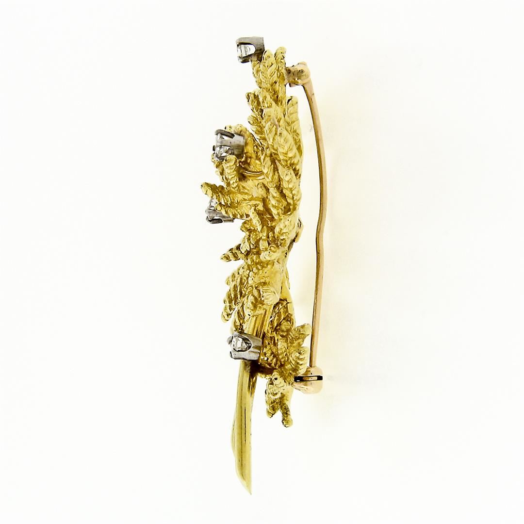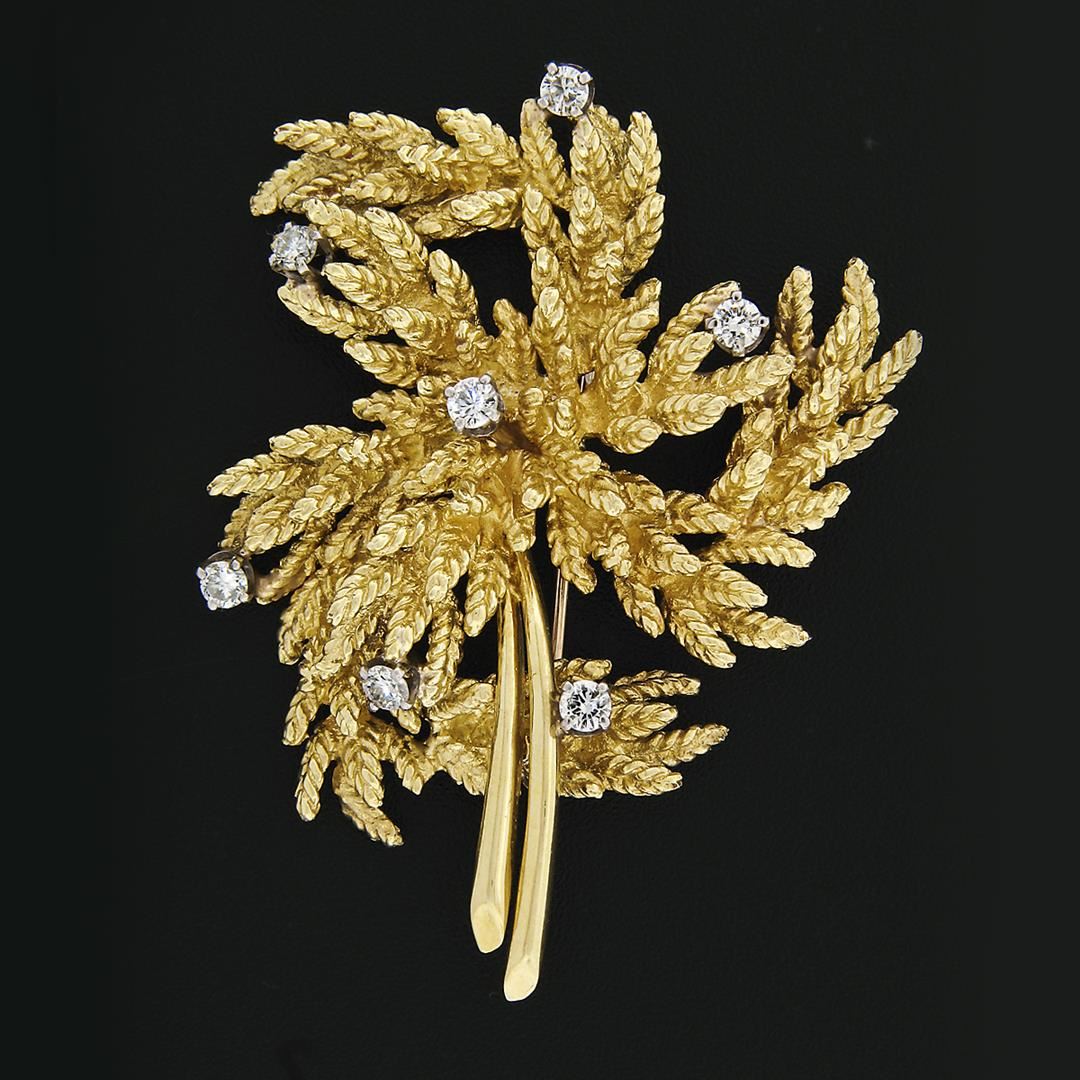 A vintage solid 18k yellow & white gold brooch, with 7 round brilliant cut natural diamonds (F/G - VS1/VS2 ; 0.65ctw). Measures 54.7x43.1mm and weighs a total of 26.22 grams.