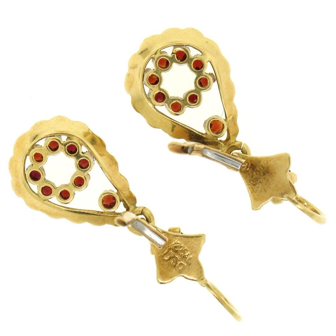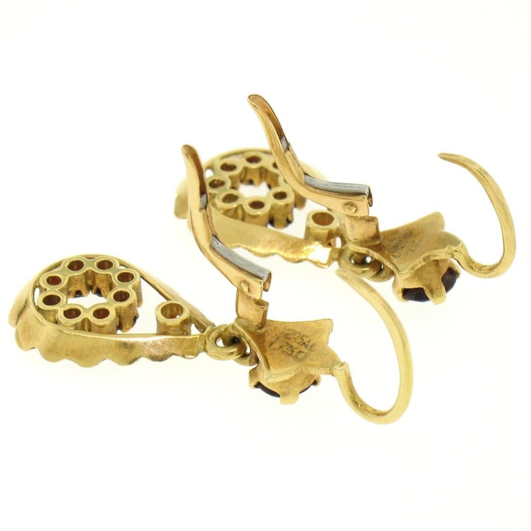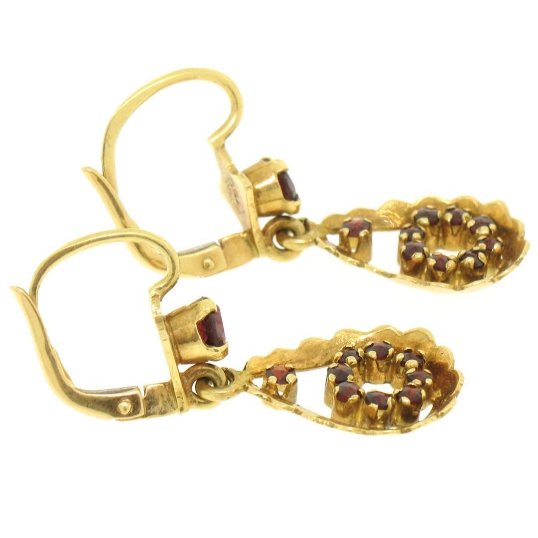 A vintage solid 18k yellow gold dangle drop earrings featuring 20 round cut natural garnets (1.00ctw). The earrings measure approximately 33x12mm and weigh a total of 5.2 grams.