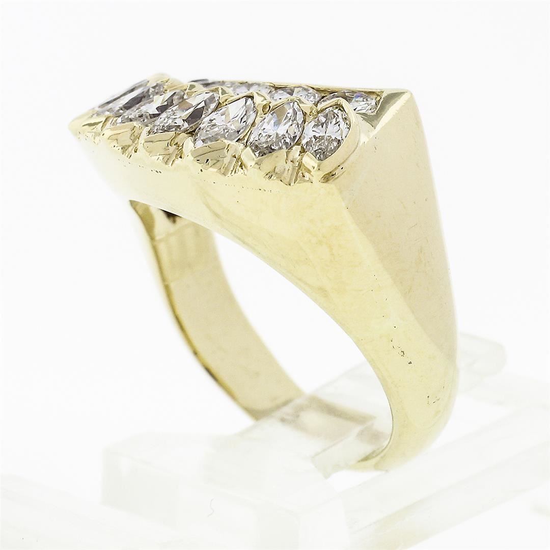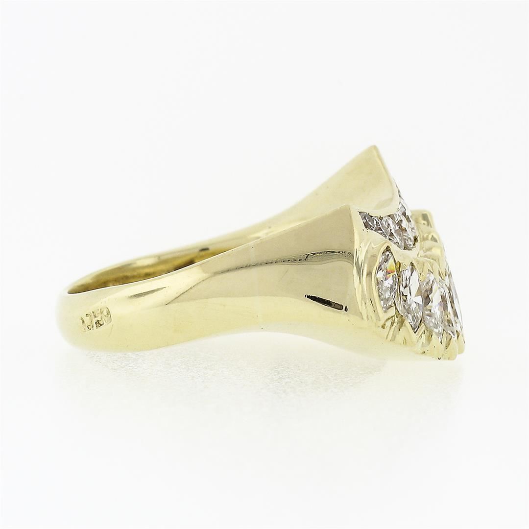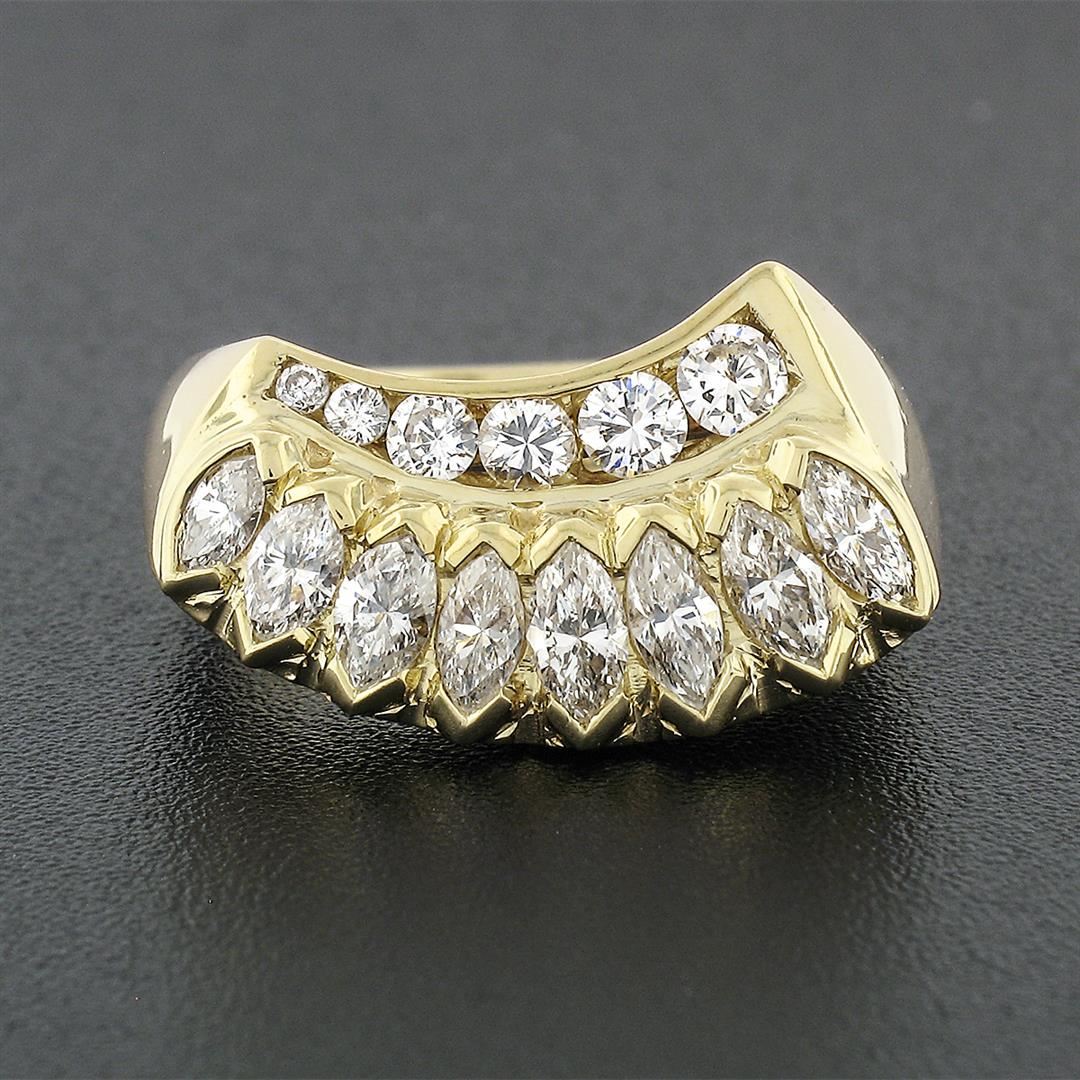A vintage solid 18k yellow gold ring, with 8 marquise cut natural diamonds (H/I- VS1/VS2; 1.10ctw), & 6 round brilliant cut natural diamonds (G/H- VS1/VS2; 0.30ctw). The ring is size 5.5, weighs a total of 7.50 grams, and measures 10mm wide.