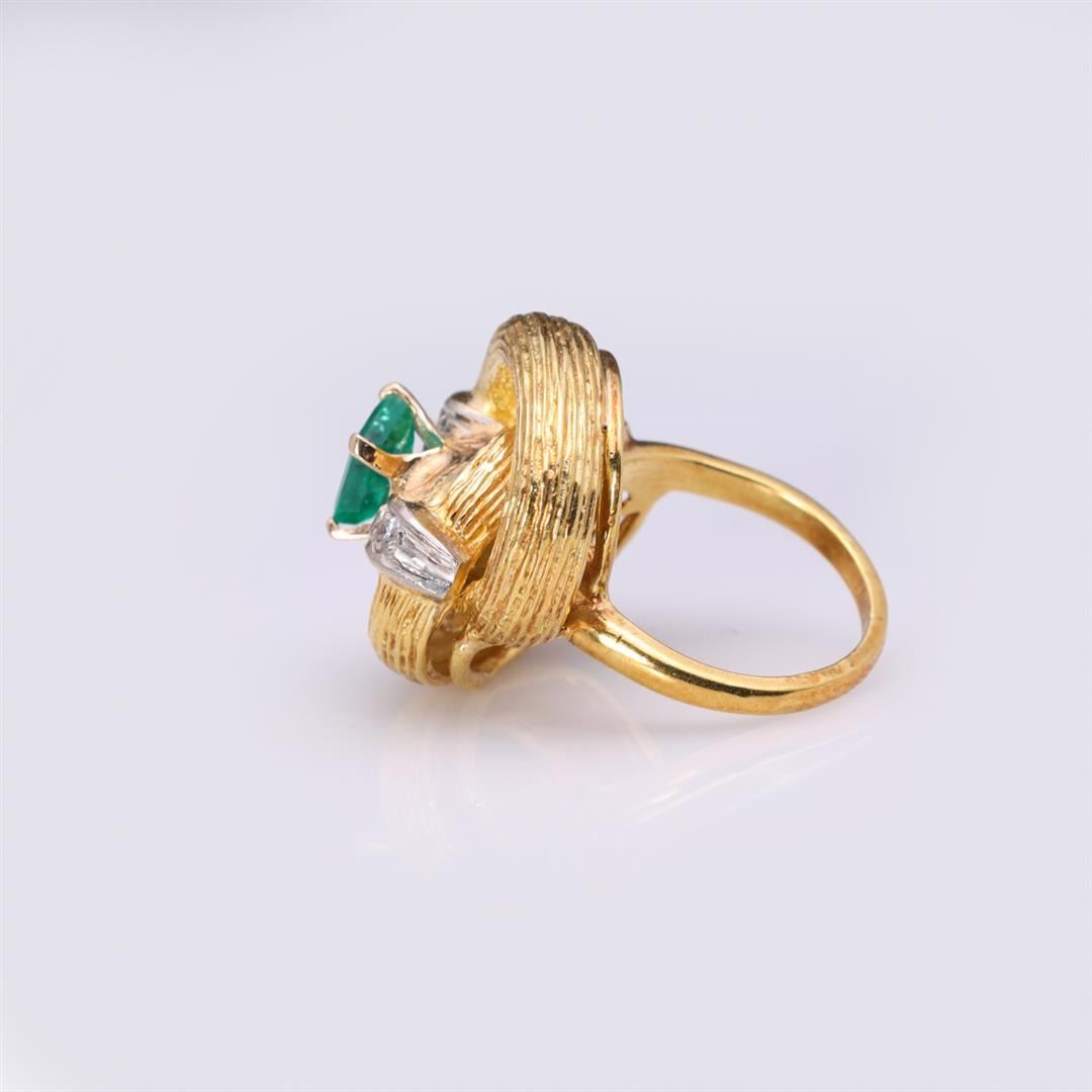 Vintage 18K Yellow Gold Emerald & Diamond Ring containing one emerald cut emerald weighing approximately 0.70 cts and four diamonds weighing approximately 0.11 cts Total weight is 11.9 gm. Estimated retail value $4,840.
