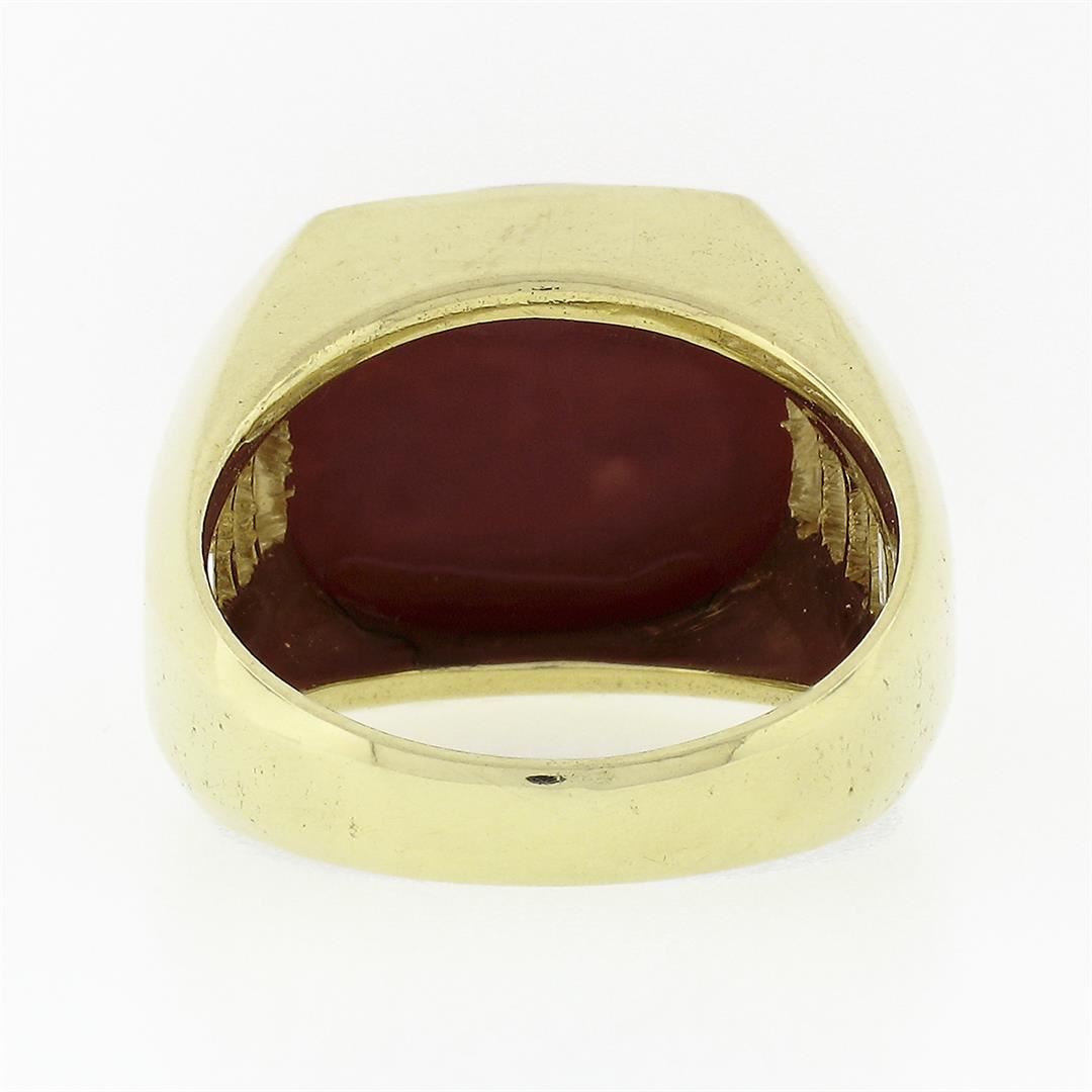 A vintage solid 18k yellow gold cocktail ring, featuring 1 Gia certified cushion cabochon cut natural coral(15.00 x 11.88 x 6.70 mm), accented with 10 baguette cut natural diamonds ( F/G - VVS2/VS1 ; 1.20ctw). The ring is size 5, weighs a total of 9.75 grams, and measures 12.8mm wide. Comes with all original relevant certifications.