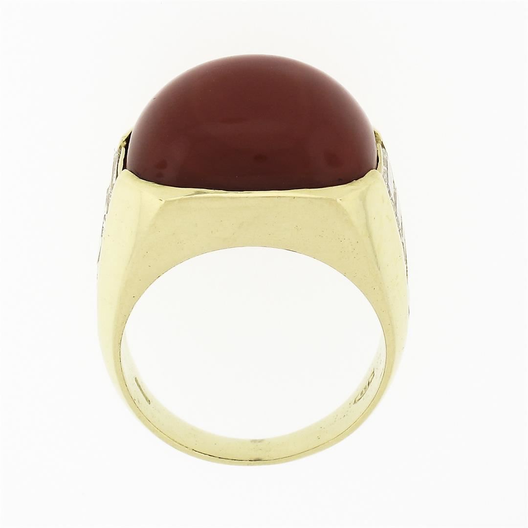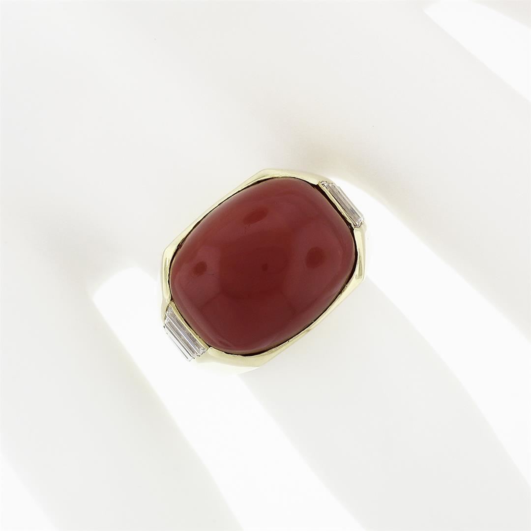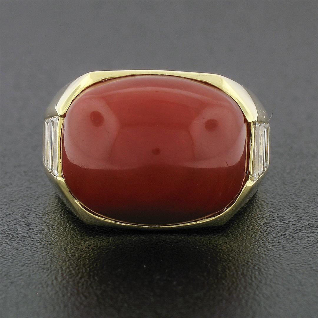 A vintage solid 18k yellow gold cocktail ring, featuring 1 Gia certified cushion cabochon cut natural coral(15.00 x 11.88 x 6.70 mm), accented with 10 baguette cut natural diamonds ( F/G - VVS2/VS1 ; 1.20ctw). The ring is size 5, weighs a total of 9.75 grams, and measures 12.8mm wide. Comes with all original relevant certifications.