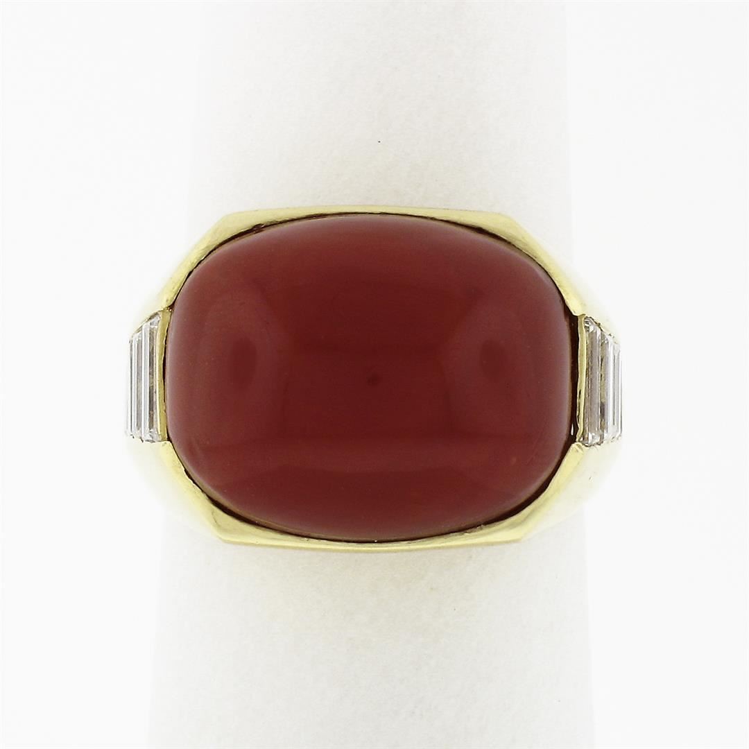 A vintage solid 18k yellow gold cocktail ring, featuring 1 Gia certified cushion cabochon cut natural coral(15.00 x 11.88 x 6.70 mm), accented with 10 baguette cut natural diamonds ( F/G - VVS2/VS1 ; 1.20ctw). The ring is size 5, weighs a total of 9.75 grams, and measures 12.8mm wide. Comes with all original relevant certifications.