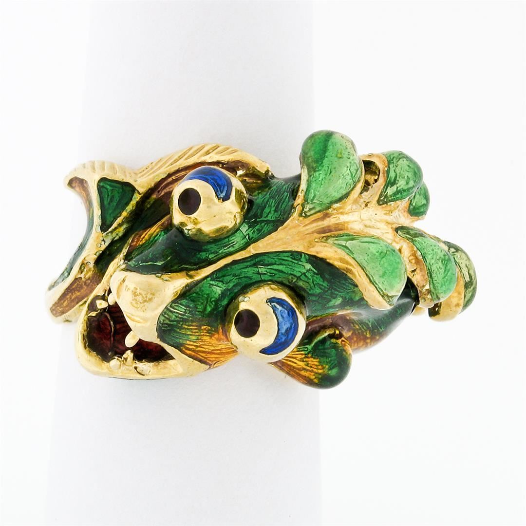 Vintage 18K Yellow Gold Multi Color Enamel Large Dragon or Fish Wrap Band Ring