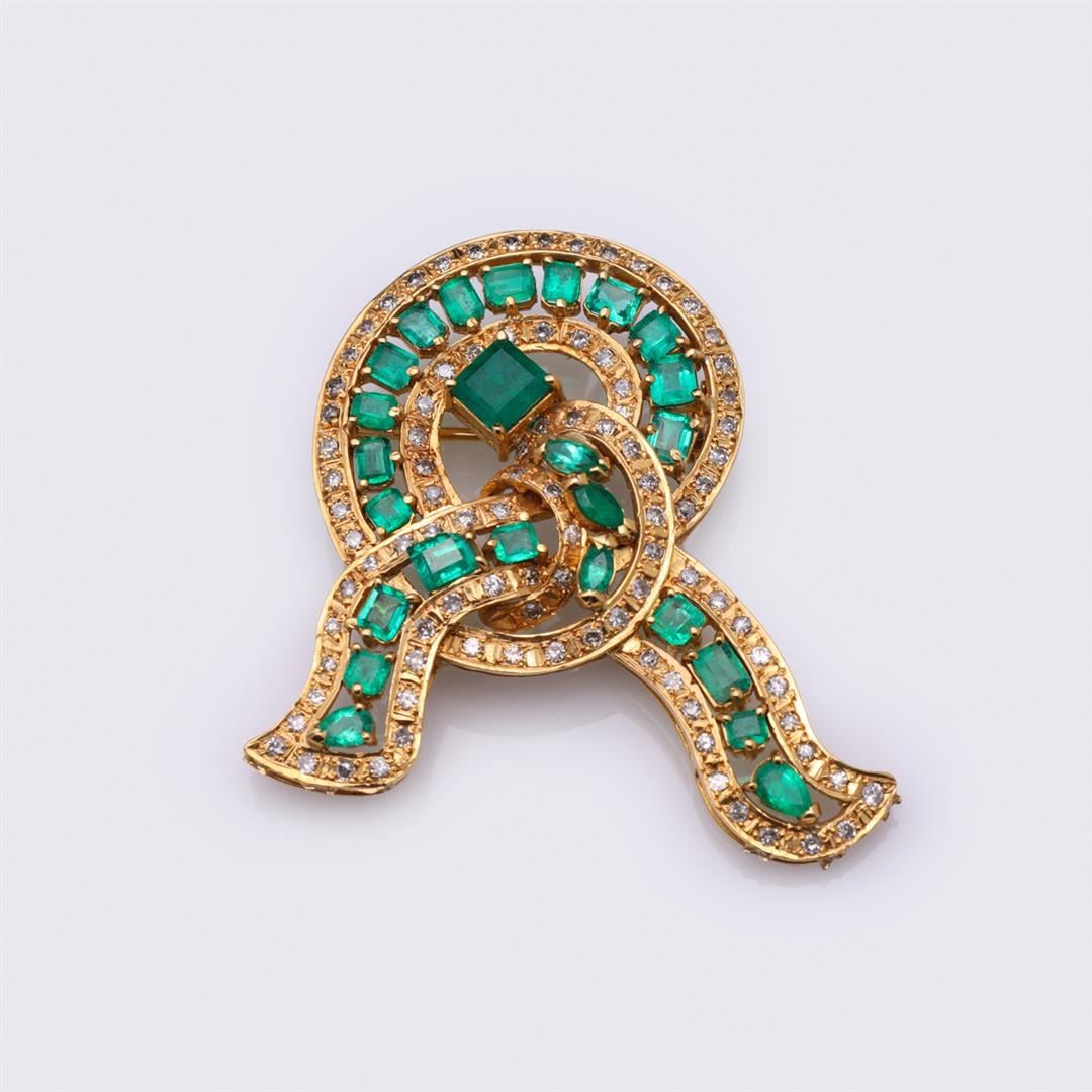 Large and fine vintage 18k yellow gold ribbon brooch, a single row of bright green emeralds of various cuts ending with a central larger emerald surrounded by interior and exterior rows of diamonds; 18.3 g, 1 7/8" x 1 3/4" (approx.)