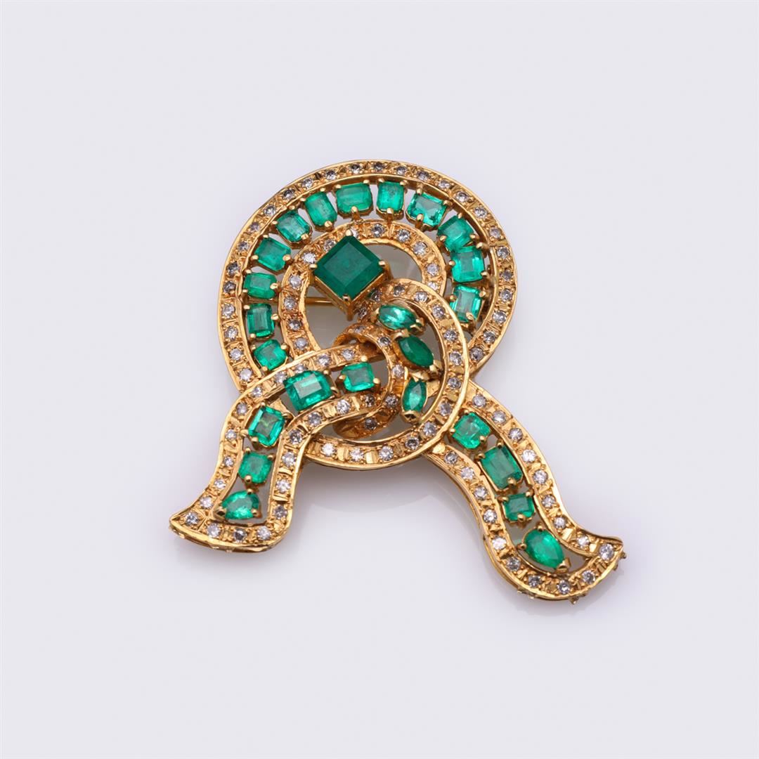 Vintage 18K Yellow Gold Ribbon Brooch with Emeralds & Diamonds containing emeralds weighing approximately 2.40cts. Ninety-six round brilliant diamonds weighing approximately 1.2 cts. Total weight is 18.2 gm. Estimated retail value $11,050.