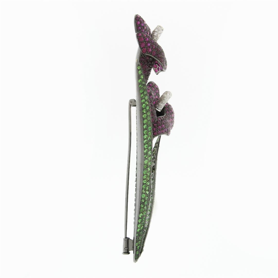 A vintage solid 18k black gold calla lily pib brooch, covered with 288 round cut natural tsavorite garnets (8.64ctw), and 291 round cut natural rubies (8.73ctw), & 62 round brilliant cut natural diamonds (G/H - SI2/I1 ; 0.93ctw). Measures 92.61x40.78mm and weighs a total of 34.11 grams.