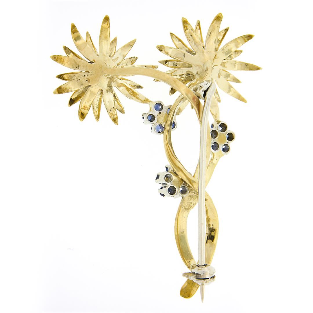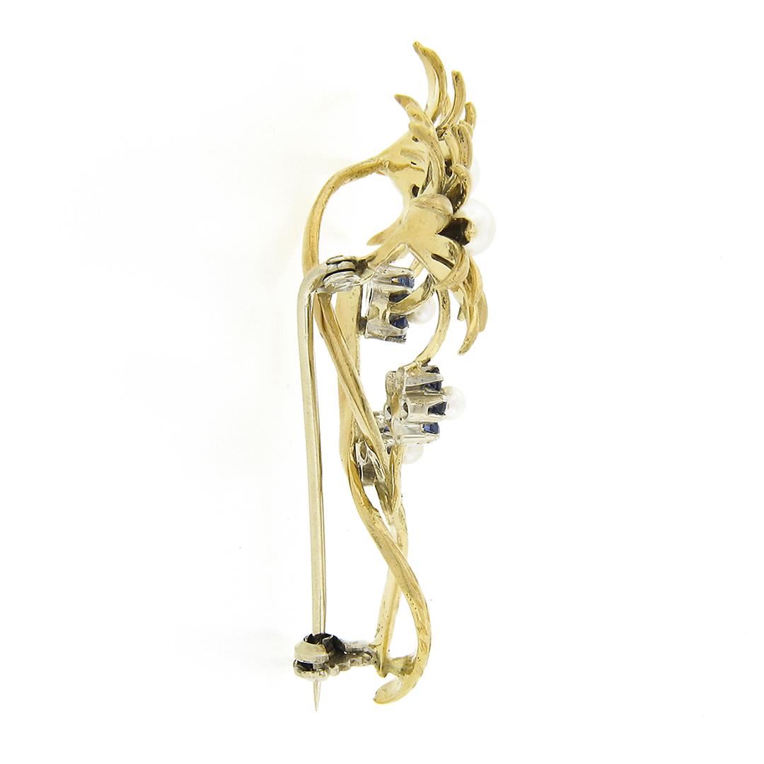 A vintage solid 18k yellow gold pin brooch, with 5 round shape cultured pearls ((2) 4.5-5.0mm each & (3) 2.5mm each), and 15 round brilliant cut natural sapphires (0.30ctw). Measures 52.0x38.80mm and weighs a total of 11.96 grams.