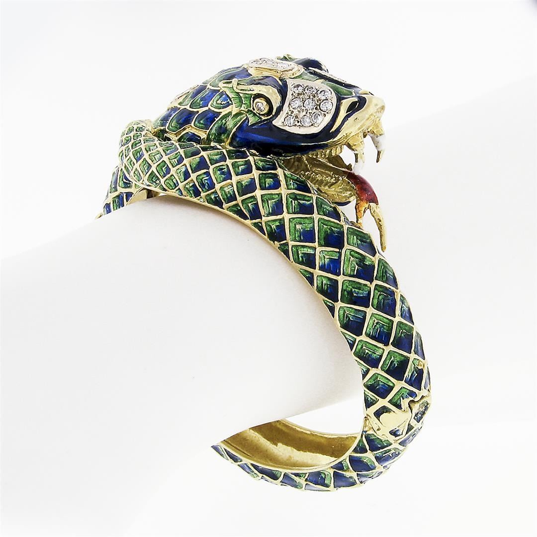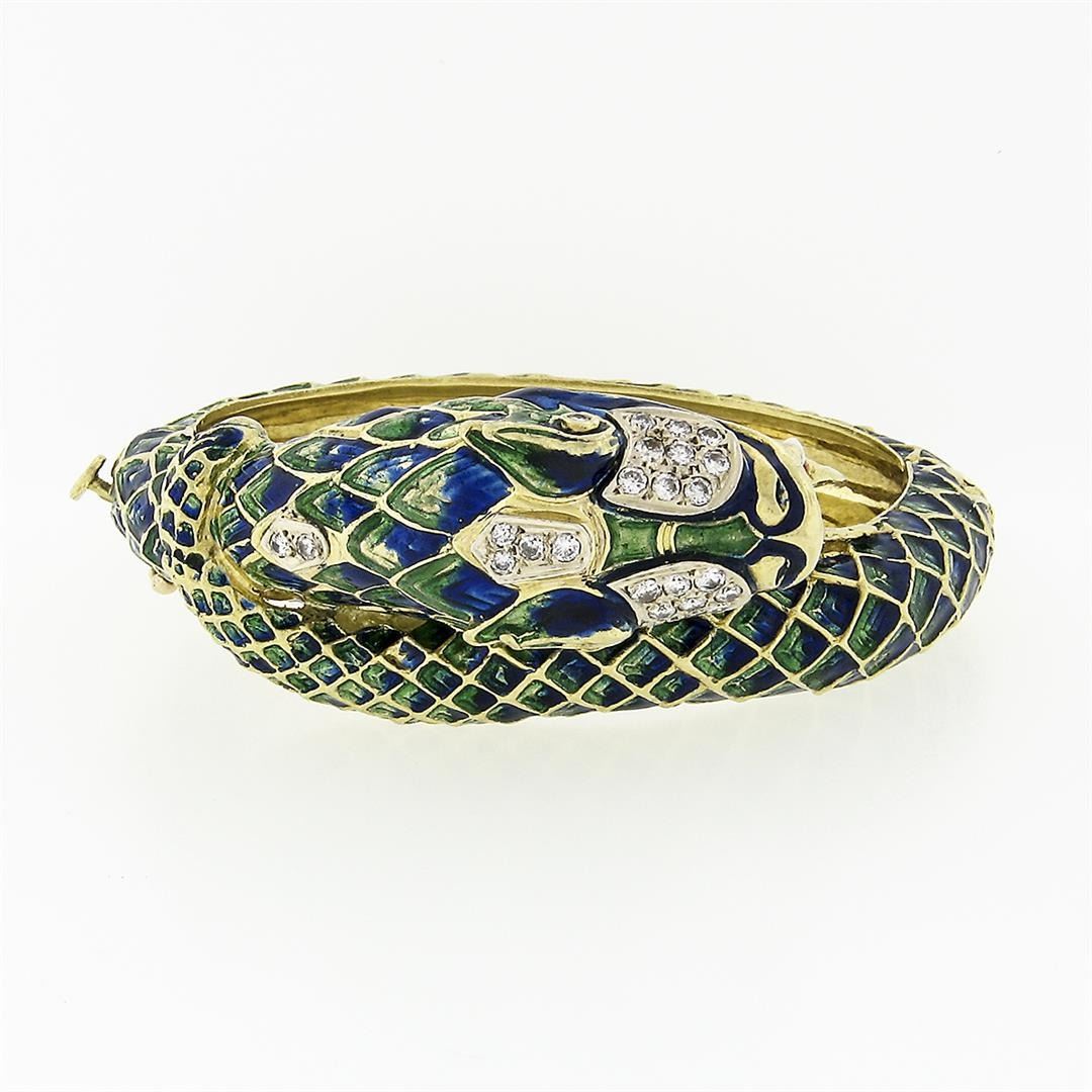 A vintage solid 18k yellow gold dragon hinged bangle bracelet, with enamel work & 24 old transitional cut natural diamonds (G/H- VS2/SI1; 0.75ctw). It weighs a total of 95.93 grams, measures 25.1mm wide, and measures 6.0 inches in length.