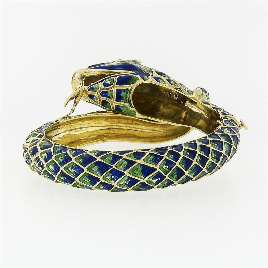 A vintage solid 18k yellow gold snake dragon bangle bracelet, with enamel work and 24 old transitional cut natural diamonds (G/H - VS2/SI1 ; 0.75ctw). It weighs a total of 95.93 grams, measures 25.1mm wide, and measures 6 inches in length.