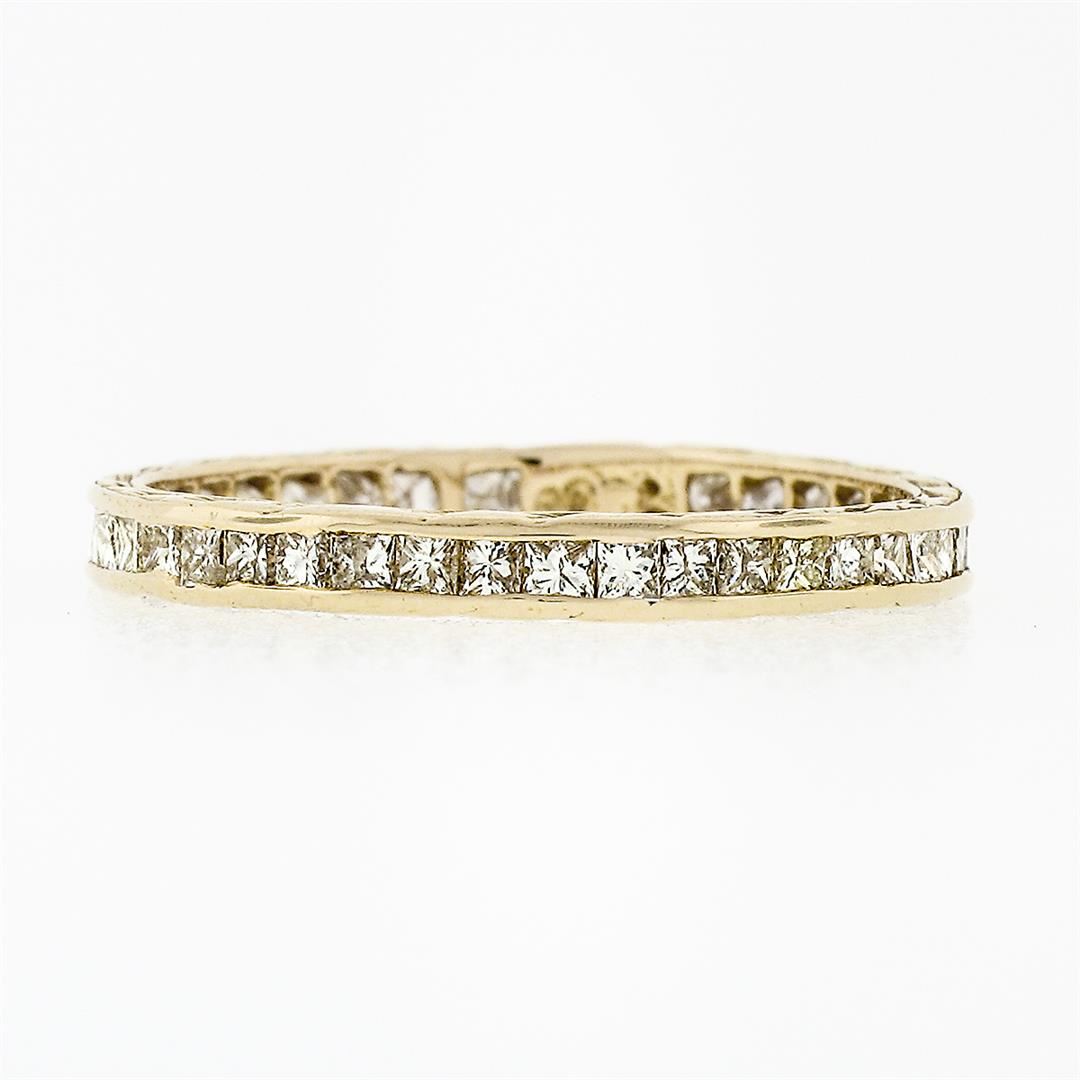 A vintage solid 18k yellow gold eternity band ring, with 36 princess cut natural diamonds (H/I - VS2/SI1 ; 0.85ctw). The ring is size 6.0, weighs a total of 1.21 grams, and measures ##mm wide.