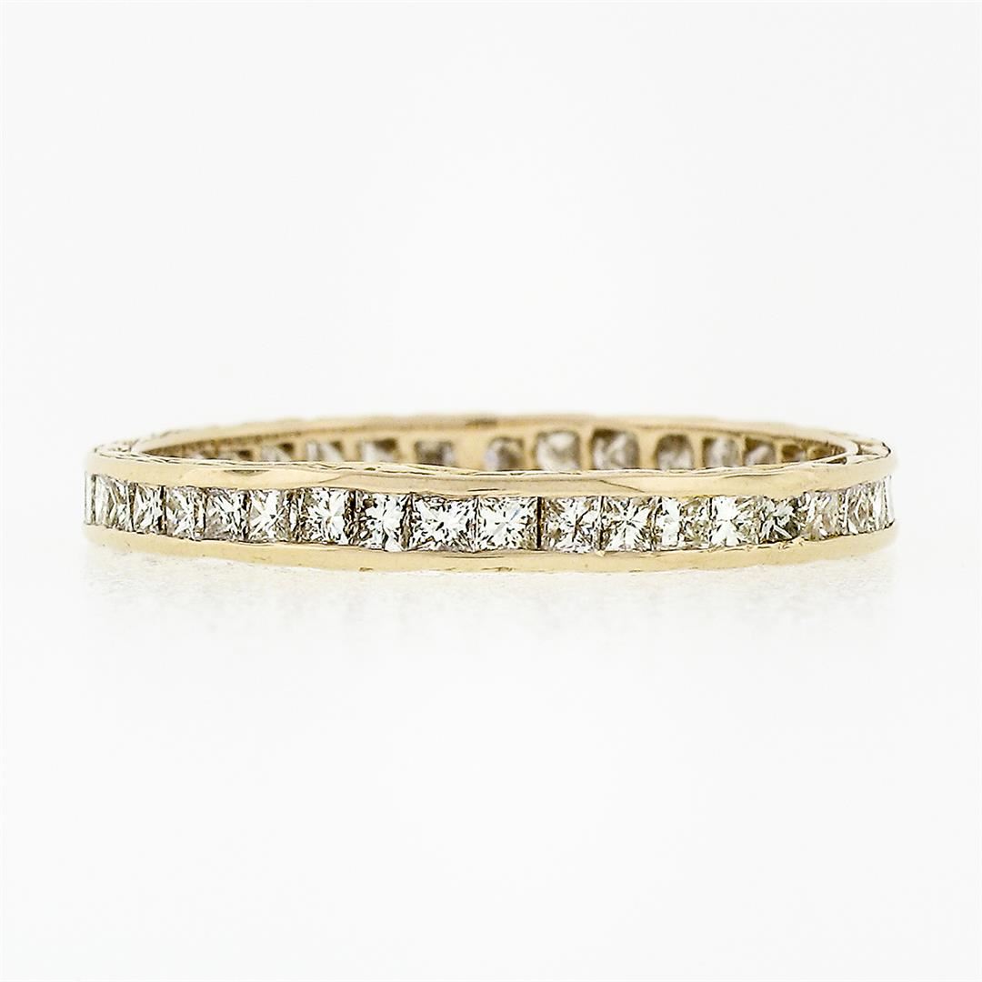 A vintage solid 18k yellow gold eternity band ring, with 36 princess cut natural diamonds (H/I - VS2/SI1 ; 0.85ctw). The ring is size 6.0, weighs a total of 1.21 grams, and measures ##mm wide.
