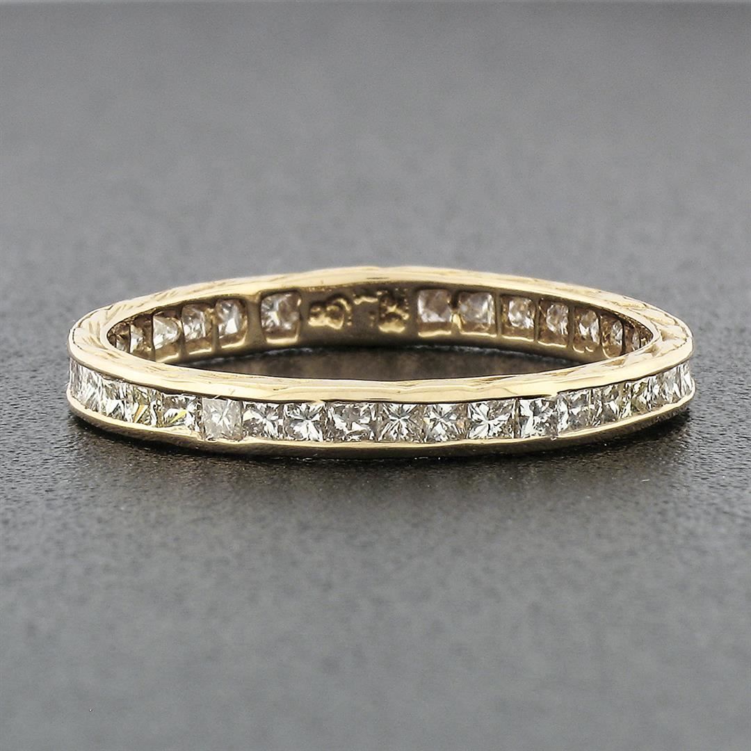 A vintage solid 18k yellow gold eternity band ring, with 36 princess cut natural diamonds (H/I - VS2/SI1 ; 0.85ctw). The ring is size 6.0, weighs a total of 1.21 grams, and measures ##mm wide.