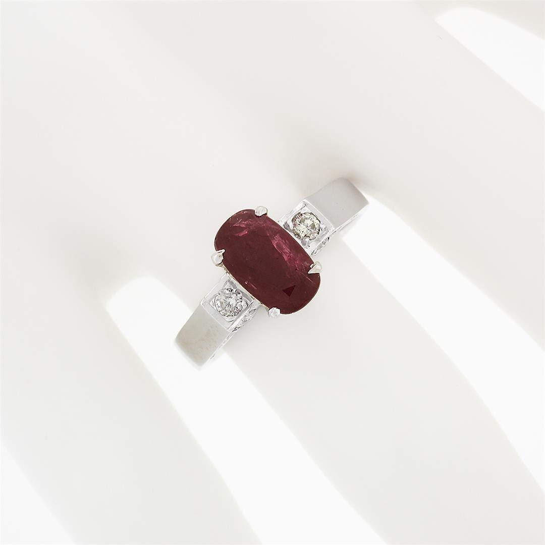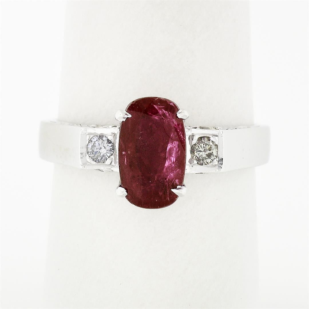A vintage solid 18k white gold engagement ring, with 1 Gia certified oval cut natural ruby (1.38ct), Accented with 6 old transitional cut natural diamonds (H/I - SI1/SI2 ; 0.24ctw). The ring is size 7.5, weighs a total of 5.45 grams, and measures 9.3mm wide. Comes with all original relevant certifications.