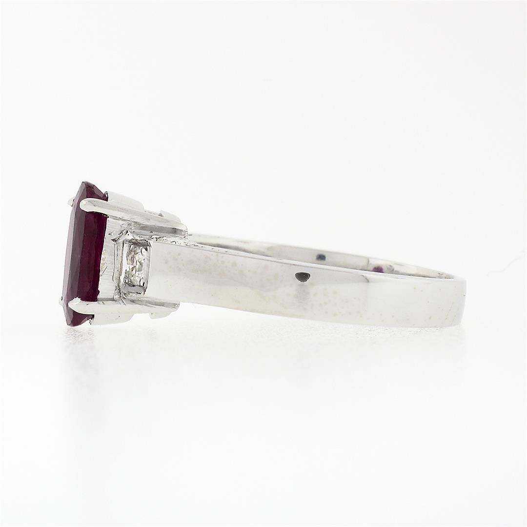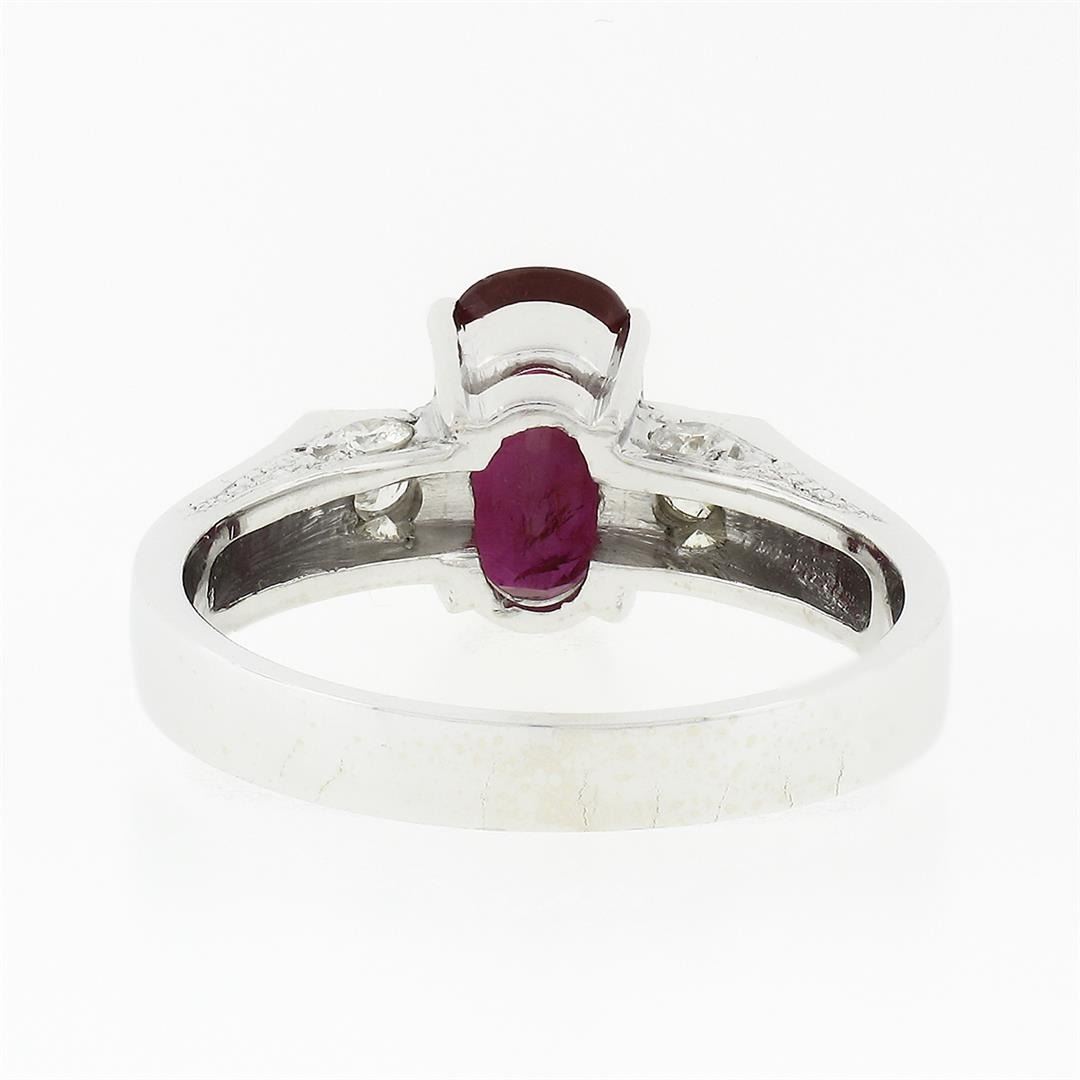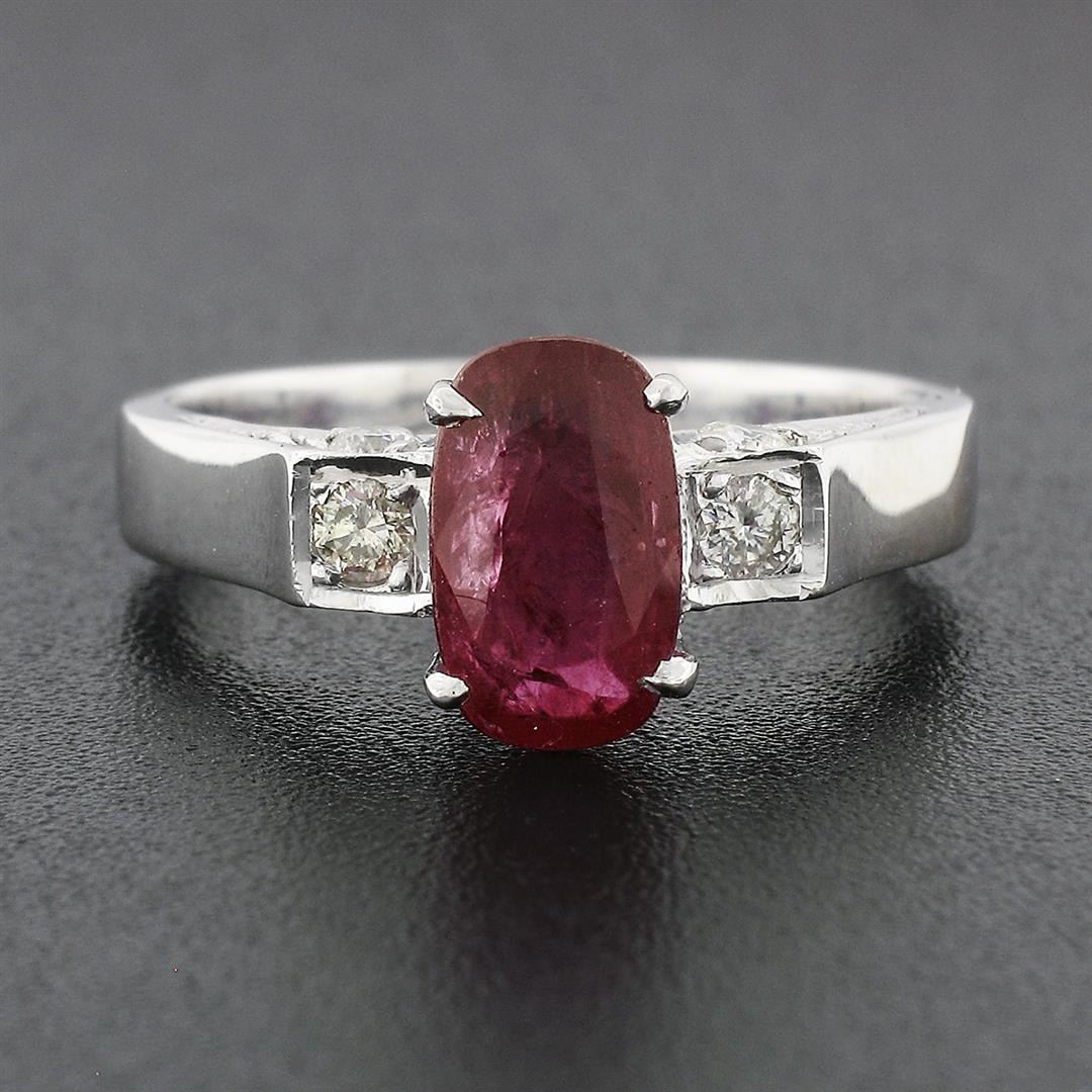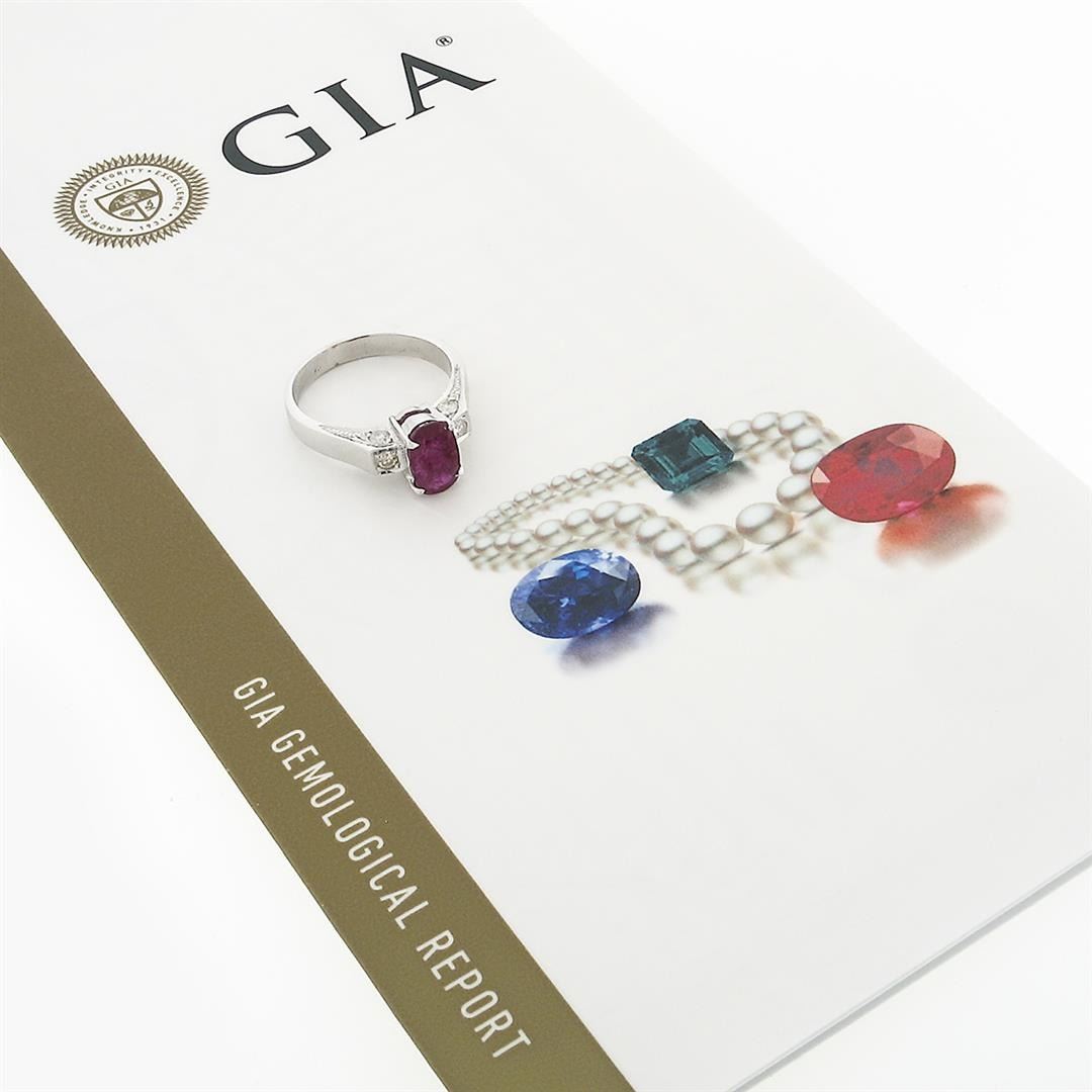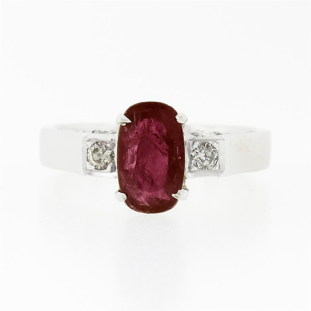 A vintage solid 18k white gold engagement ring, with 1 Gia certified oval cut natural ruby (1.38ct), Accented with 6 old transitional cut natural diamonds (H/I - SI1/SI2 ; 0.24ctw). The ring is size 7.5, weighs a total of 5.45 grams, and measures 9.3mm wide. Comes with all original relevant certifications.