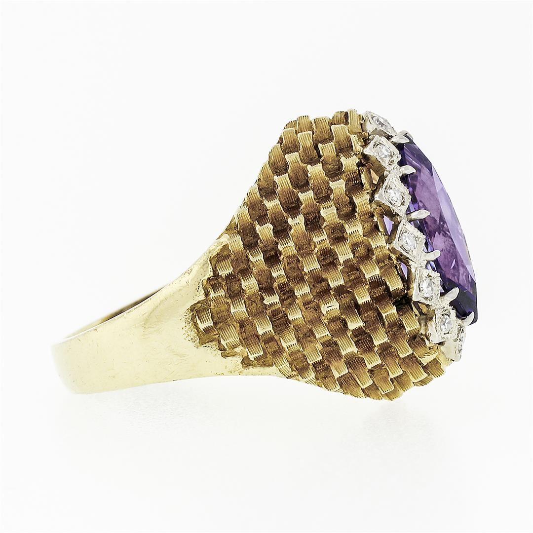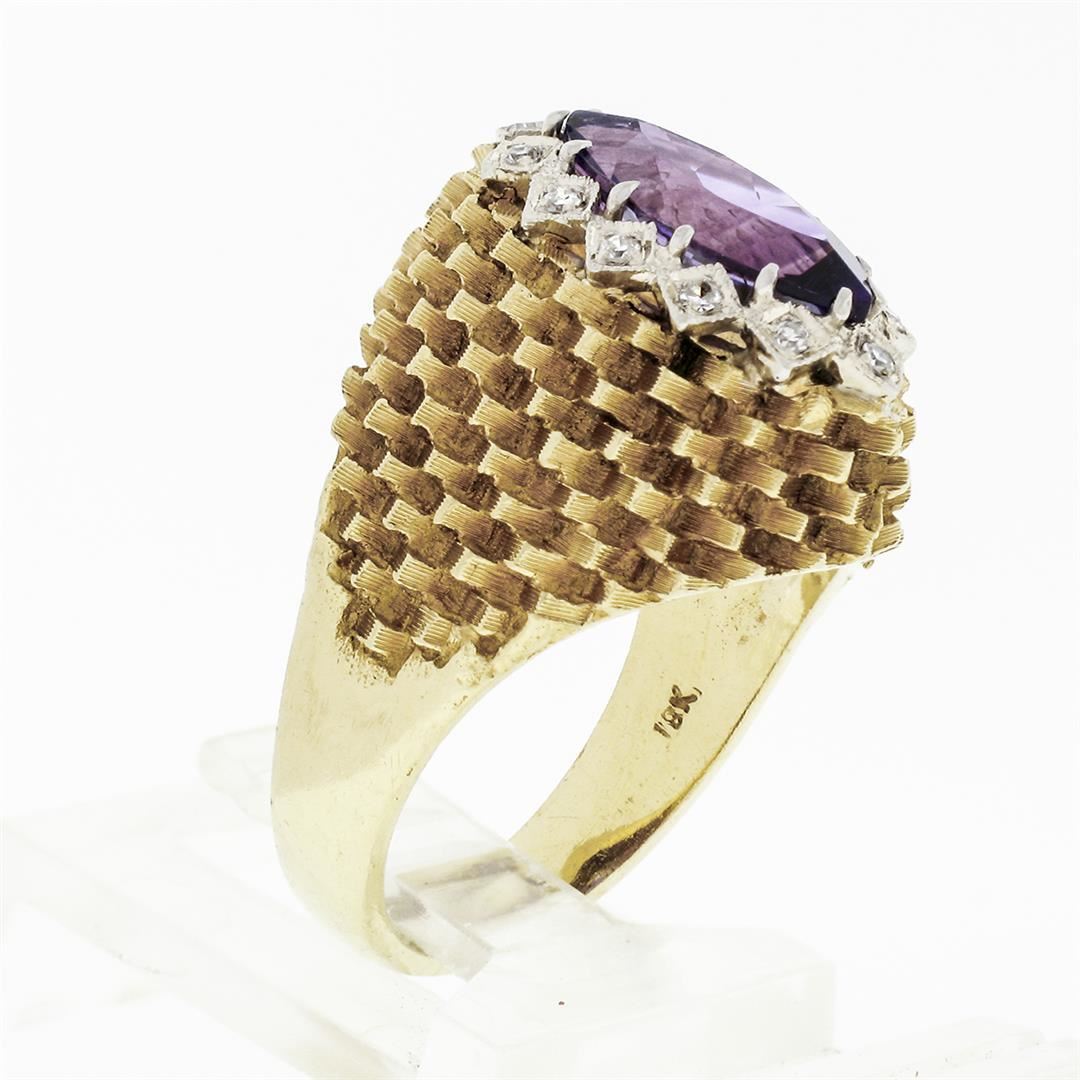A solid 18k yellow gold textured ring, with 1 marquise cut natural amethyst (1.60ct ), surrounded with a halo of 12 round single cut natural diamonds (F/G - VS1/VS2 ; 0.16ctw). The ring is size 6.5, weighs a total of 8.16 grams, and measures 18.25mm wide.