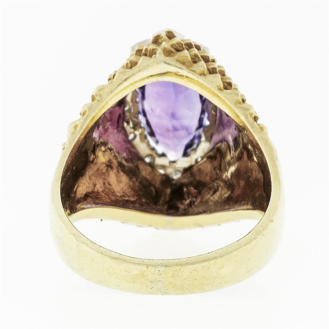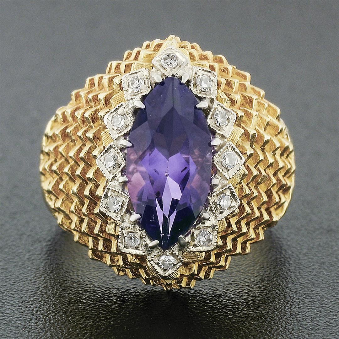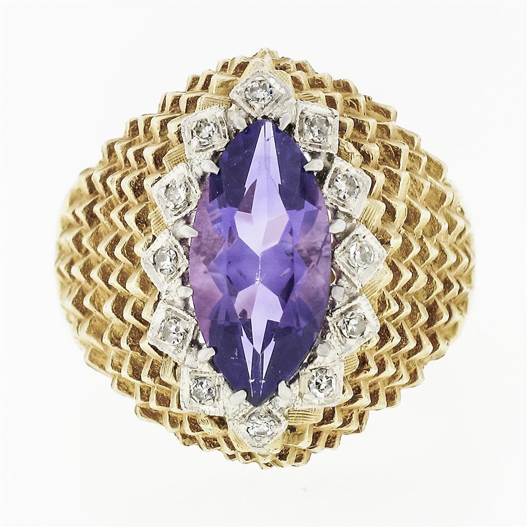 A solid 18k yellow gold textured ring, with 1 marquise cut natural amethyst (1.60ct ), surrounded with a halo of 12 round single cut natural diamonds (F/G - VS1/VS2 ; 0.16ctw). The ring is size 6.5, weighs a total of 8.16 grams, and measures 18.25mm wide.
