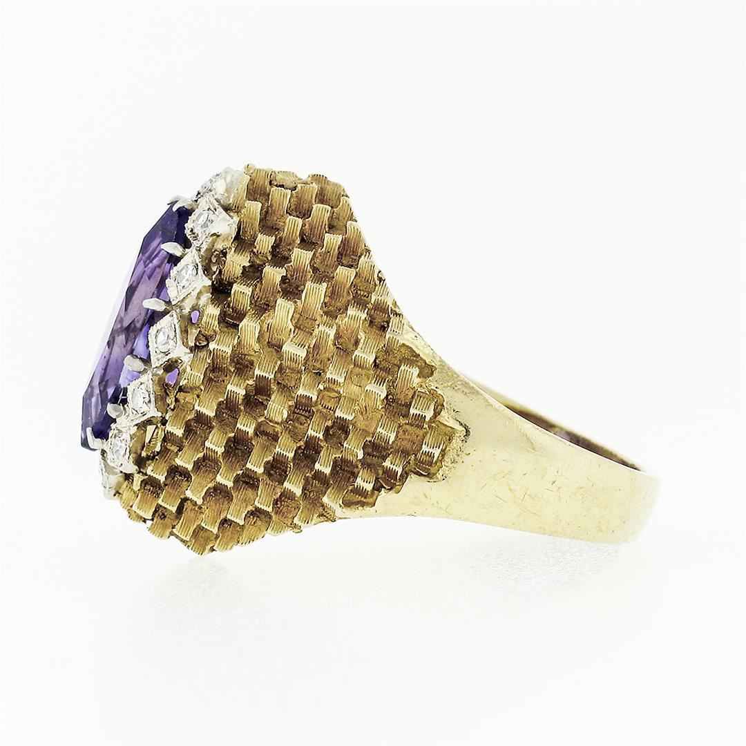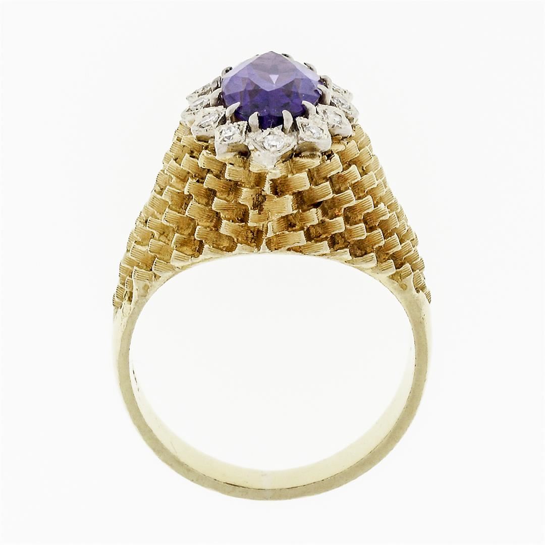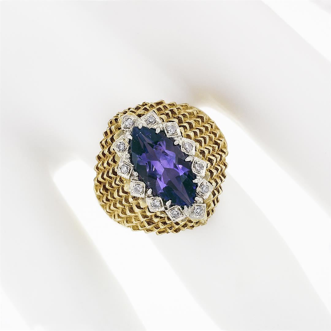 A solid 18k yellow gold textured ring, with 1 marquise cut natural amethyst (1.60ct ), surrounded with a halo of 12 round single cut natural diamonds (F/G - VS1/VS2 ; 0.16ctw). The ring is size 6.5, weighs a total of 8.16 grams, and measures 18.25mm wide.