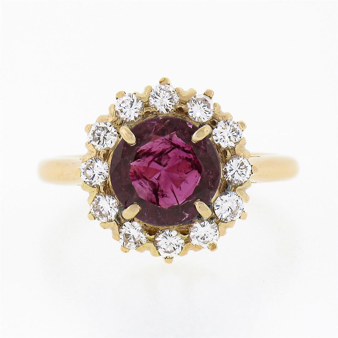 A vintage solid 18k yellow gold cluster ring, with 1 Gia certified round cut natural ruby (1.50ct), surrounded with a halo of 12 round brilliant cut natural diamonds (G/H - VS1/VS2 ; 0.50ctw). The ring is size 6.0, weighs a total of 4.80 grams, and measures 13.20mm wide. Comes with all original relevant certifications.