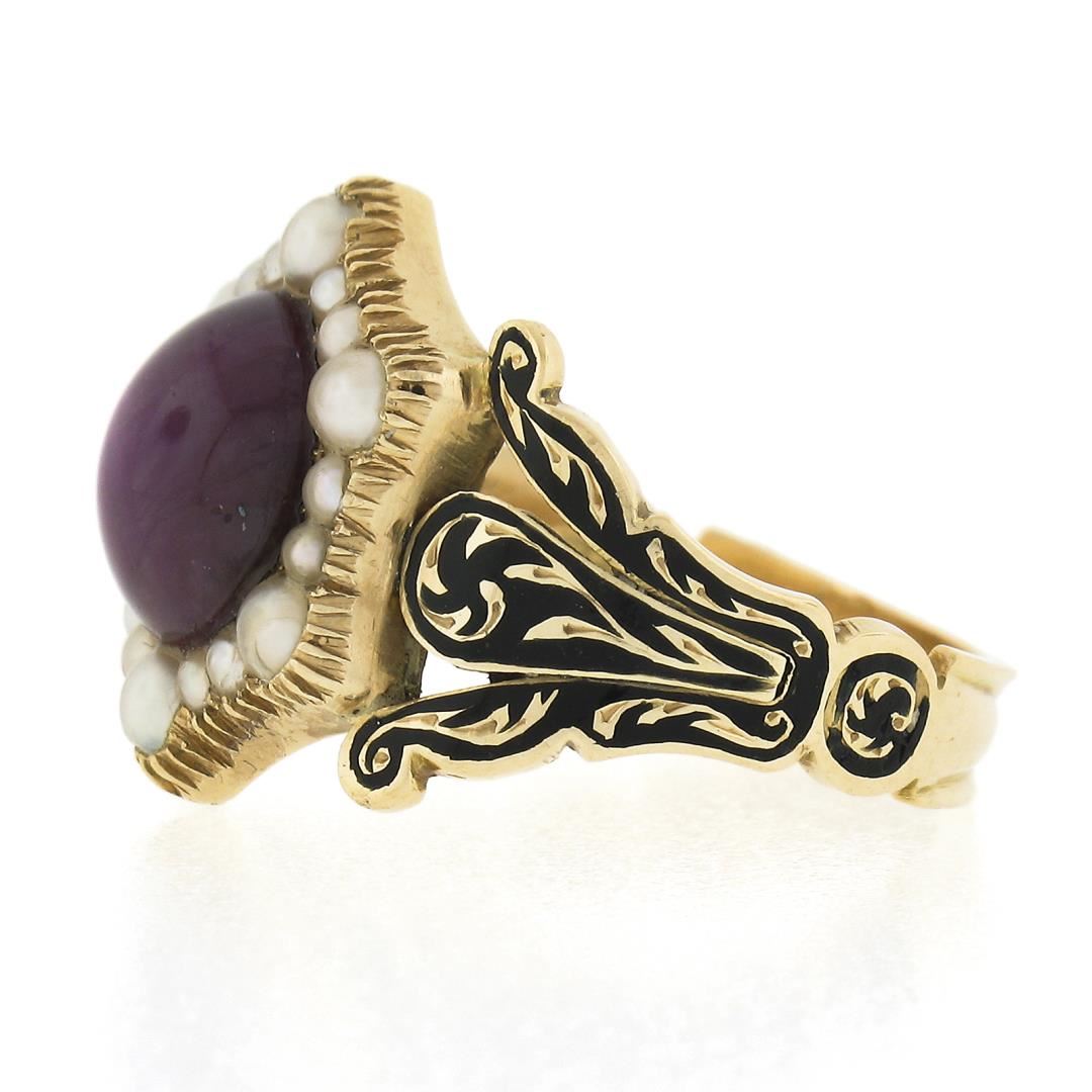 A vintage solid 18k yellow gold band ring, with enamel work, 1 round cabochon cut natural star sapphire ( 3.50ct ), and 18 round shape cultured pearsl (2.7x1.4mm). The ring is size 7.5, weighs a total of 5.12 grams, and measures 15.75mm wide.