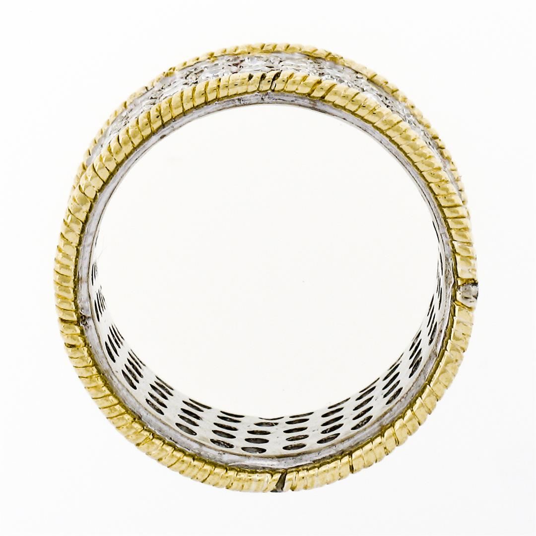 A vintage solid 18k white and yellow gold wide band ring, with 145 round brilliant cut natural diamonds (F/G - VS1/VS2 ; 3.60ctw). The ring is size 5.5, weighs a total of 8.3 grams, and measures 12.63mm wide.