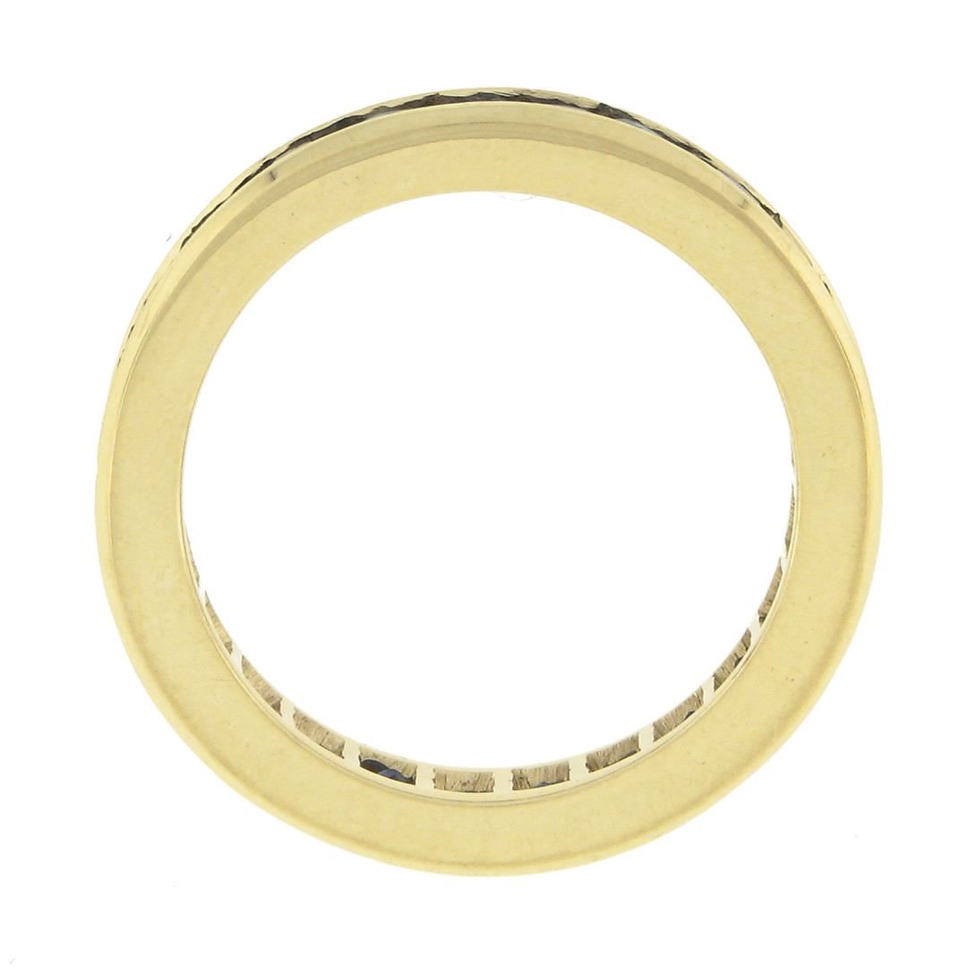A vintage solid 18k yellow gold eternity band ring, with GIA graded 25 French square cut natural sapphires (3ctw). The ring is size 6.5, weighs a total of 3.84 grams, and measures 3.5mm wide. Comes with all original relevant certifications.