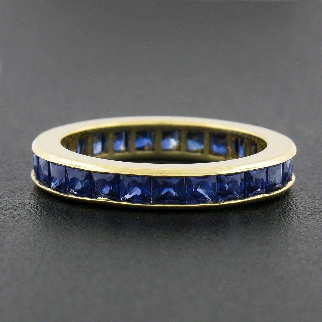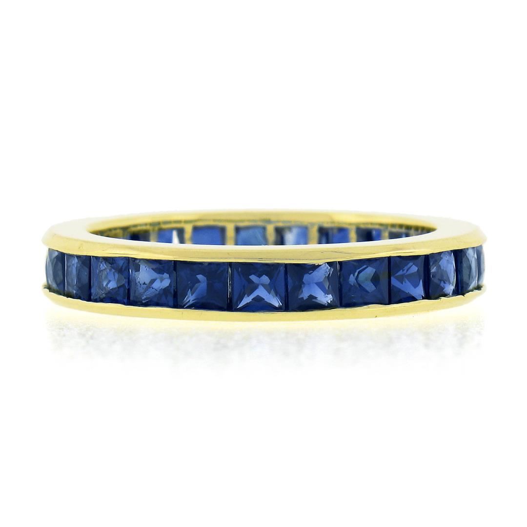 A vintage solid 18k yellow gold eternity band ring, with GIA graded 25 French square cut natural sapphires (3ctw). The ring is size 6.5, weighs a total of 3.84 grams, and measures 3.5mm wide. Comes with all original relevant certifications.