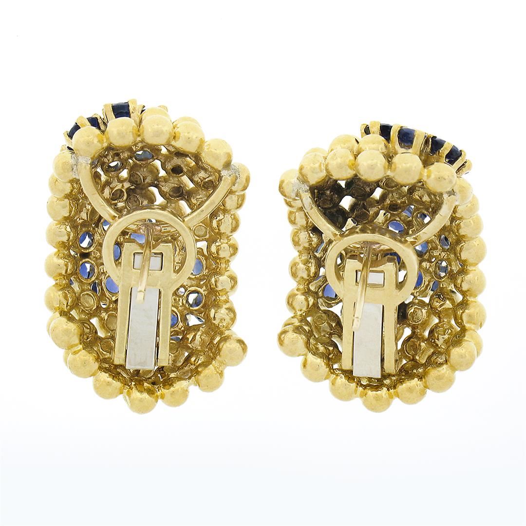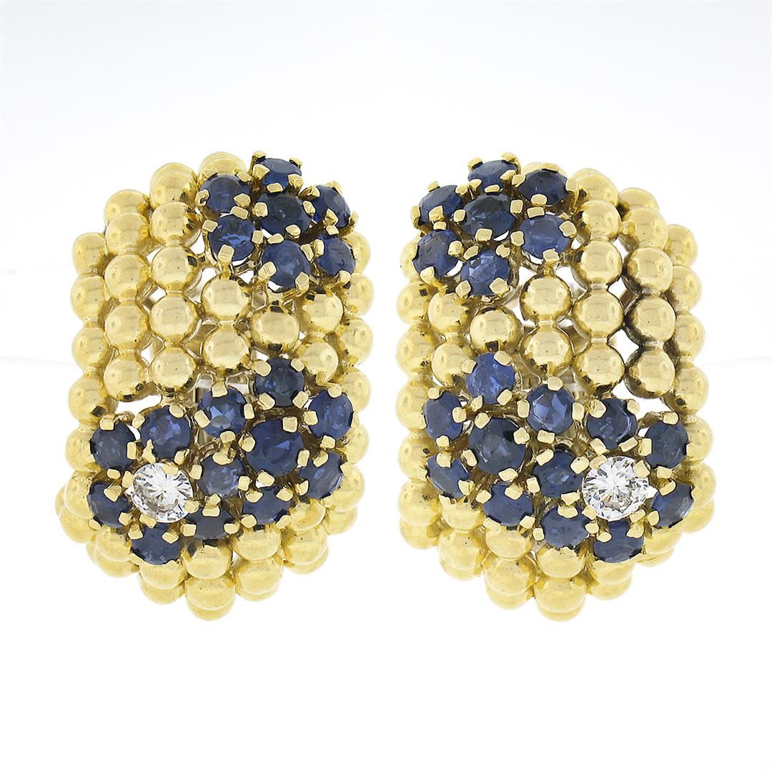 A vintage solid 18k yellow gold earrings, with 38 round brilliant cut natural sapphires (4.25ctw ), and 2 round brilliant cut natural diamonds (F/G - VS1/VS2 ; 0.42ctw). The earrings measure approximately 26.70x17.30mm and weigh a total of 30.70 grams.