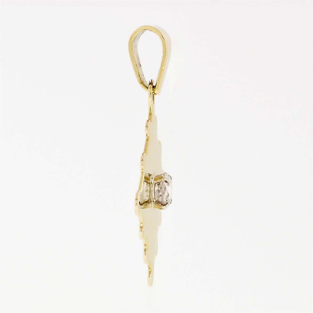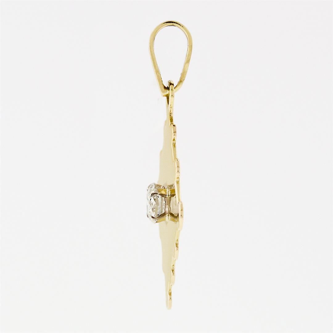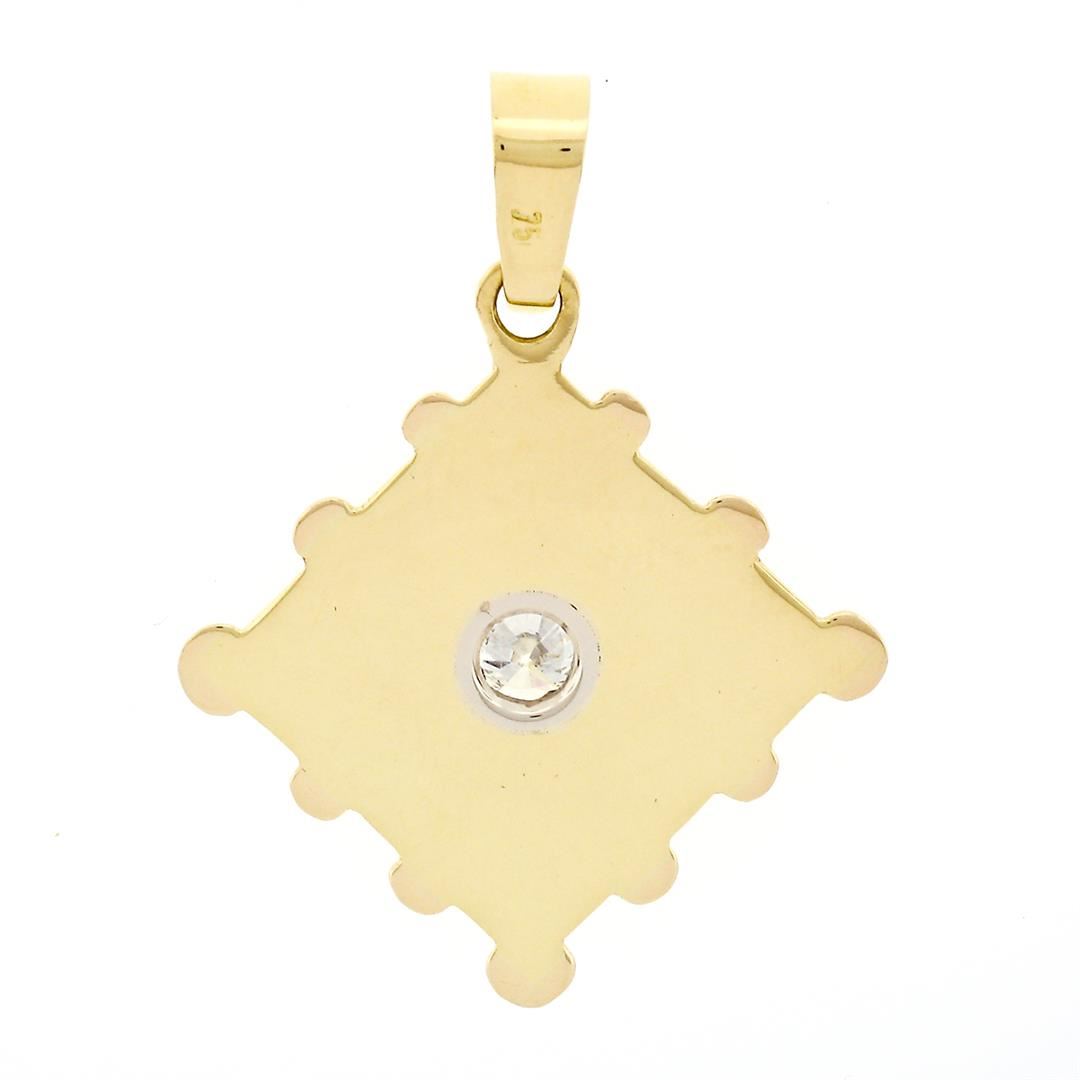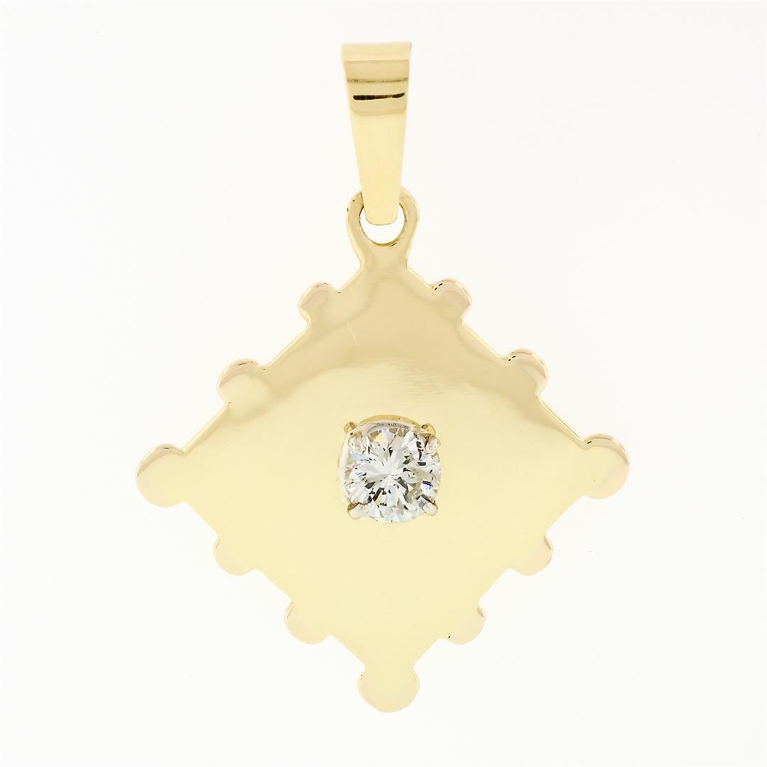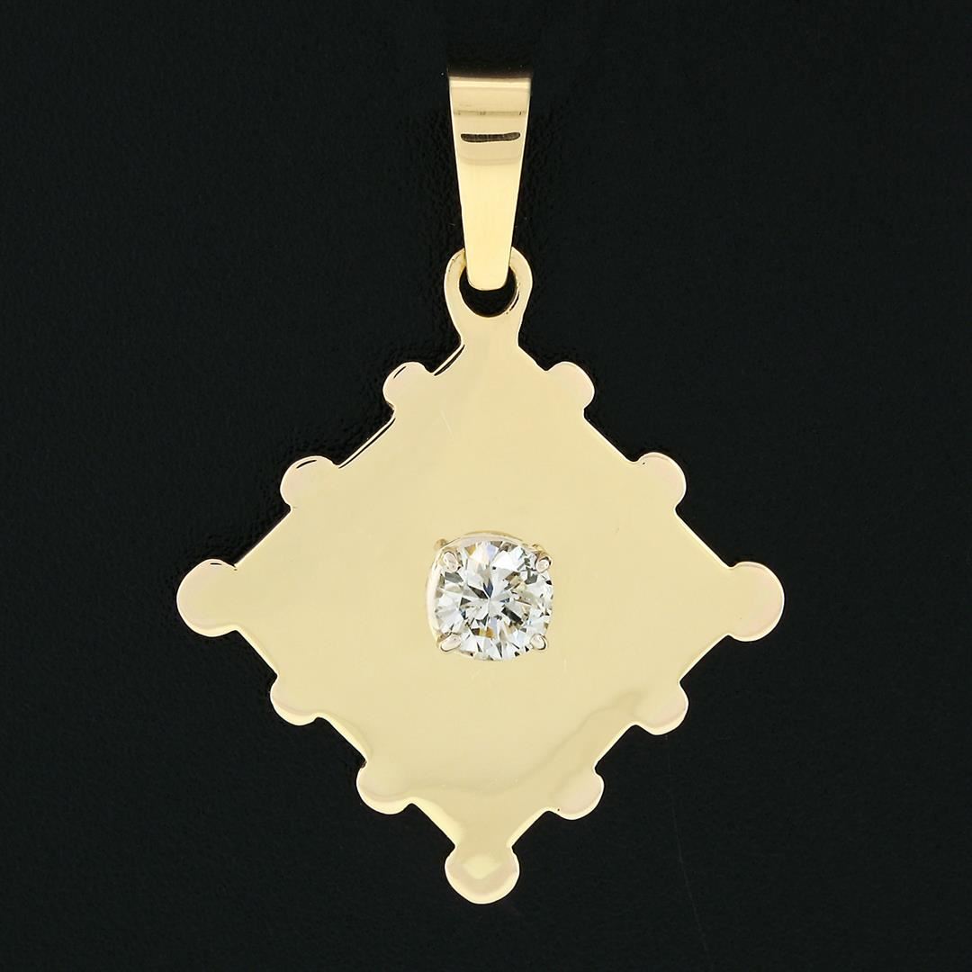 A solid 18k yellow gold puzzle piece stamp pendant, with 1 round transitional cut natural diamond (G - SI2 ; 0.53ct). The pendant weighs a total of 3.72 grams, measures 34.95x25.39mm including the bail, and the inside of the bail measures 6.2x3.8mm.