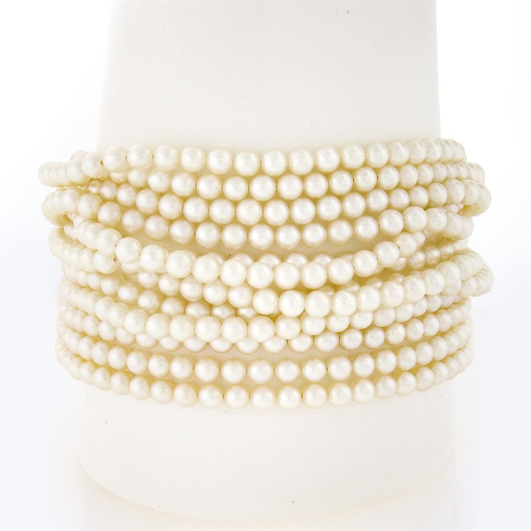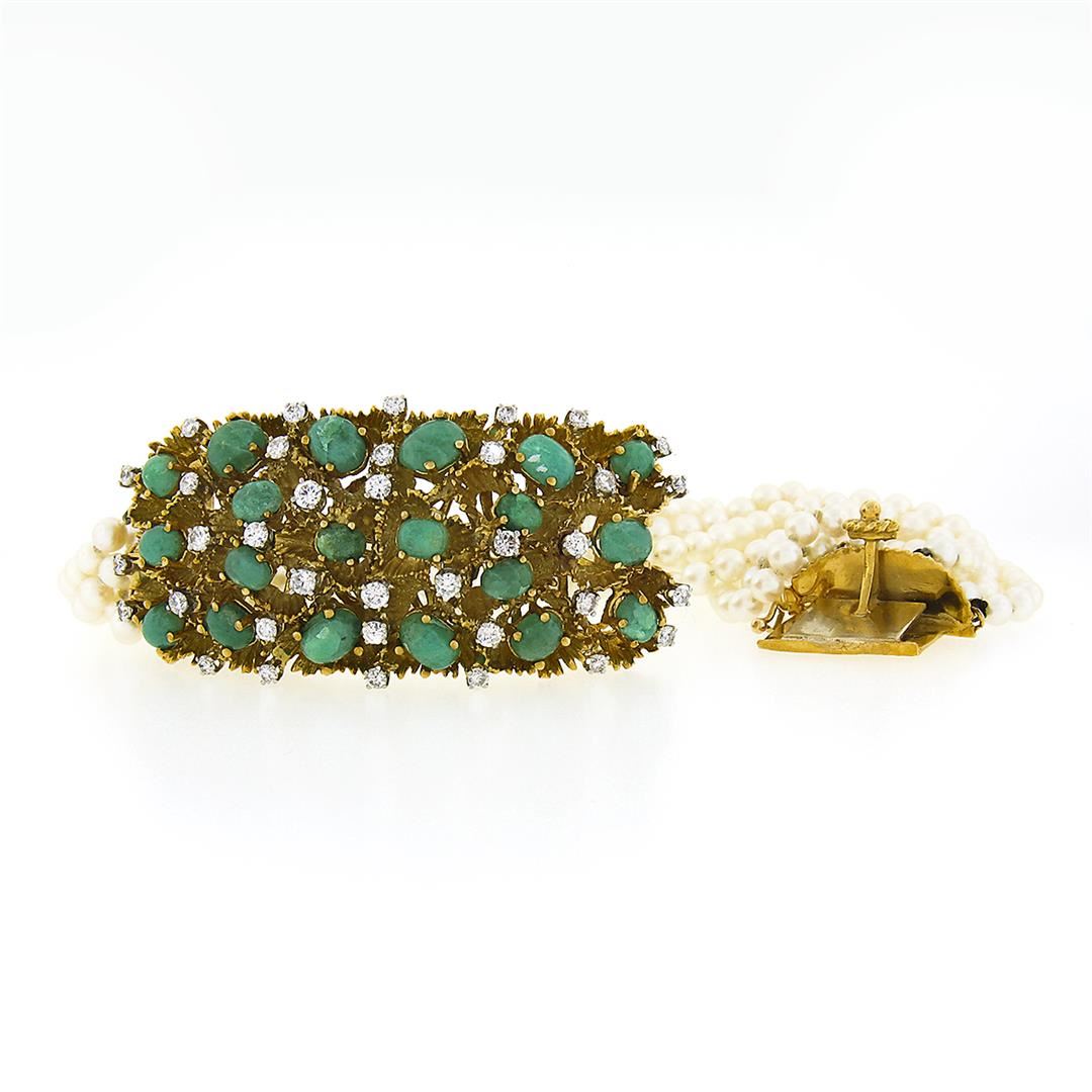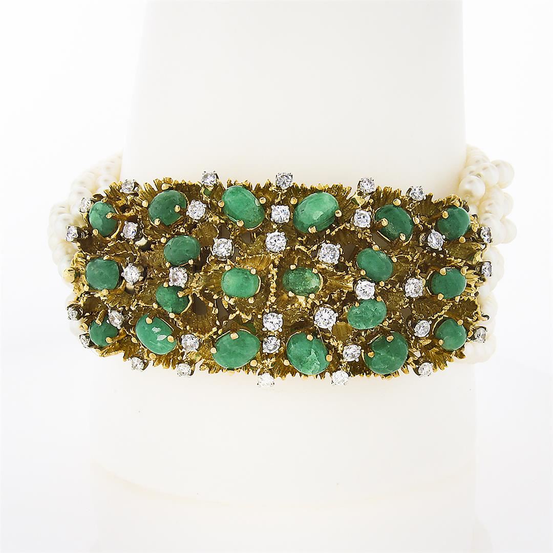 A vintage solid 18k yellow gold strand bracelet, with numerous round shape cultured pearls (3.5 to 4mm each), and 20 oval cabochon cut natural emeralds (13.0ctw), and 36 round brilliant cut natural diamonds (F/G - VS1/VS2 ;1.65ctw). It weighs a total of 88.68 grams, measures 29.0mm wide, and measures 7 inches in length.
